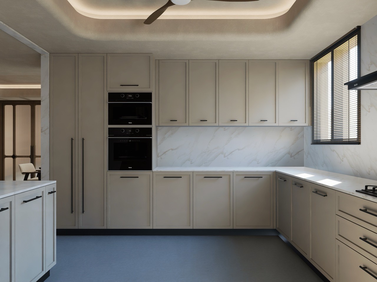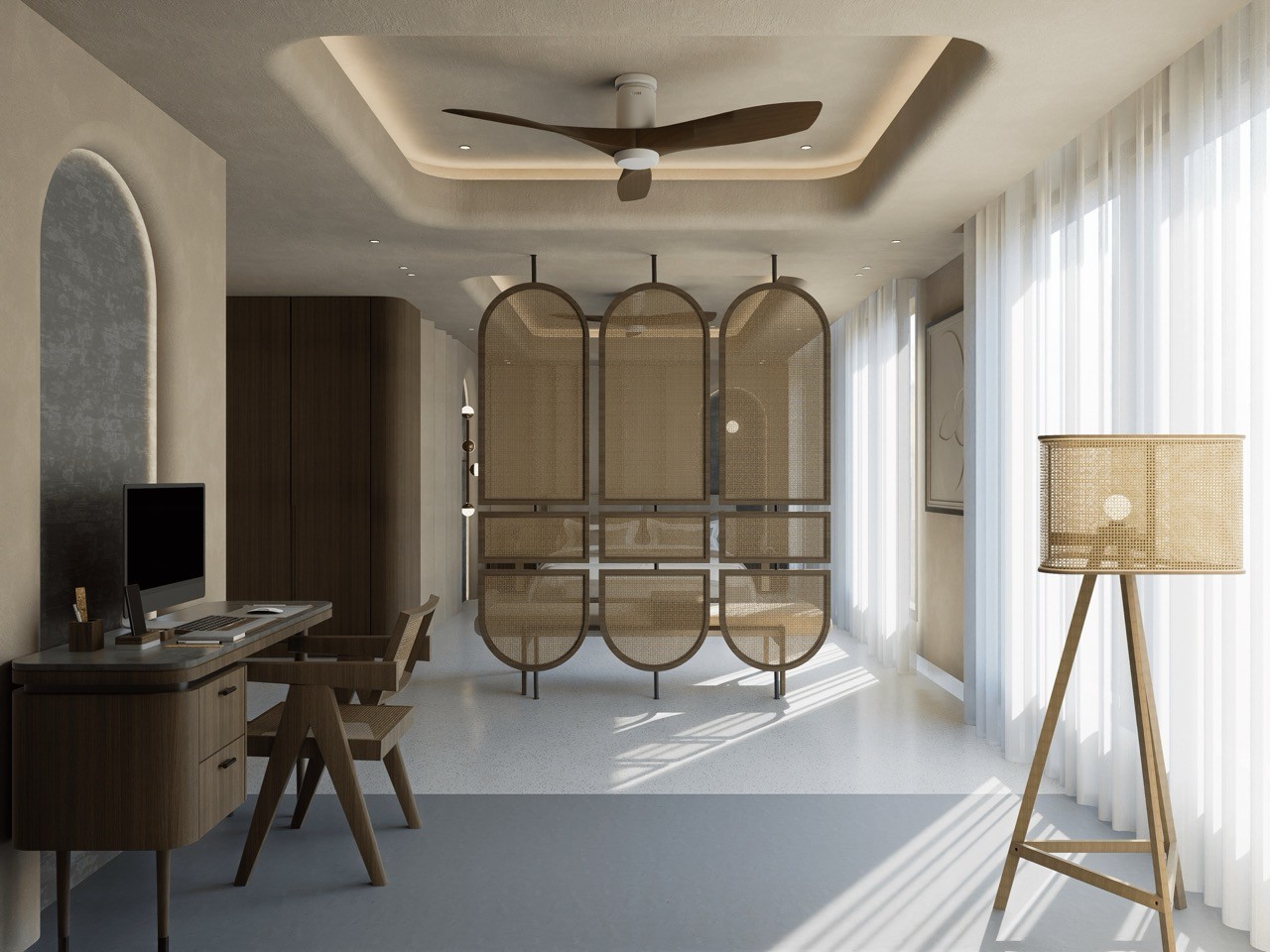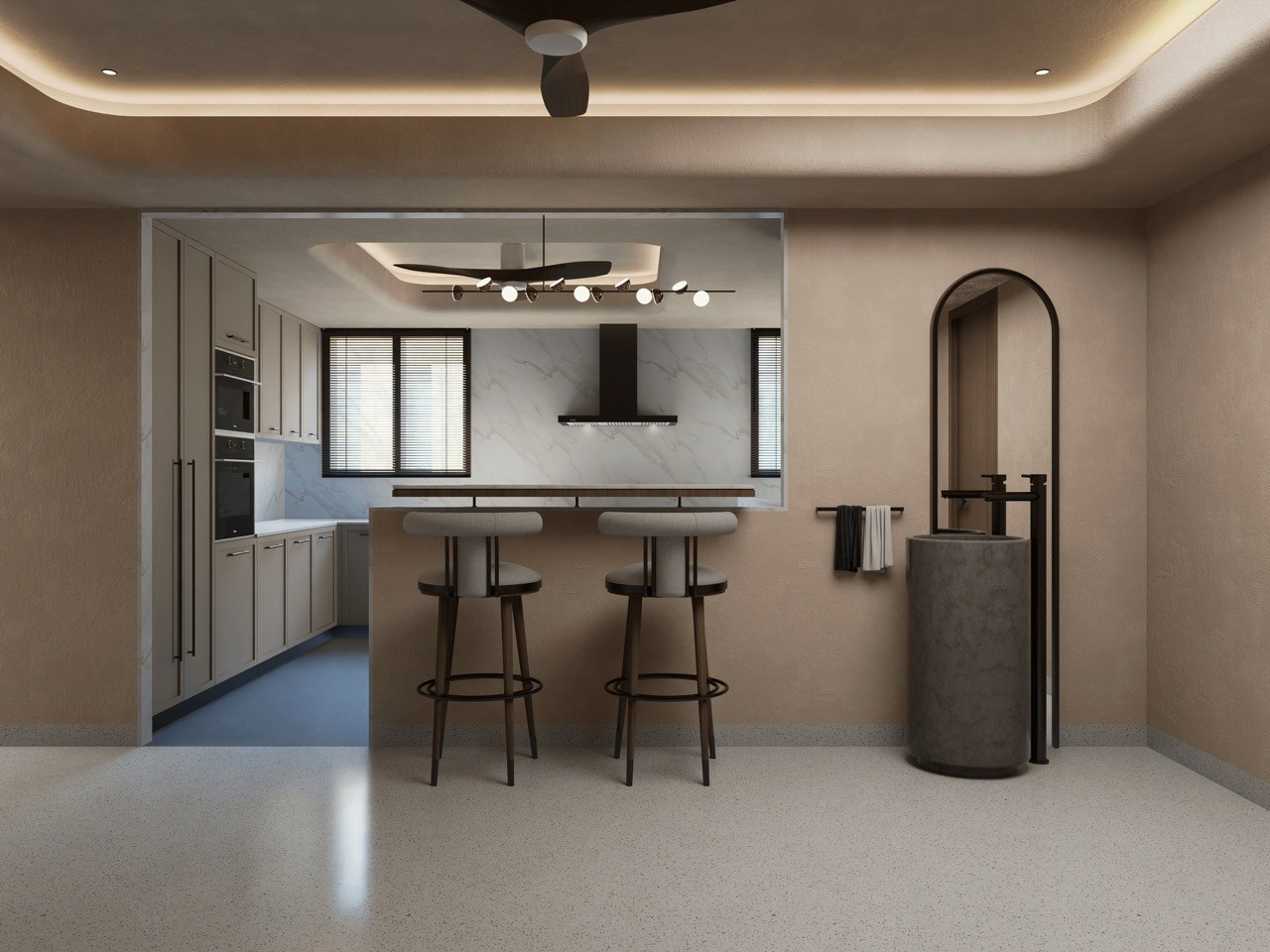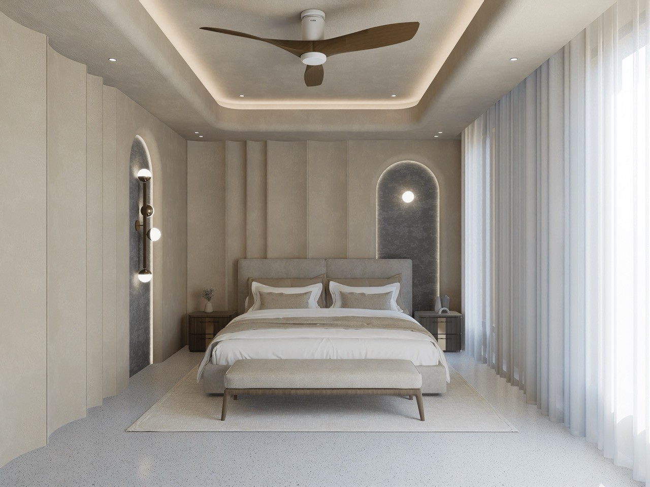 The layered ceiling with recessed lighting and a sleek ceiling fan adds depth. Textured walls and arched niches introduce a Mediterranean-inspired touch. A mix of materials like metal, glass, and stone creates a refined yet cozy ambiance.