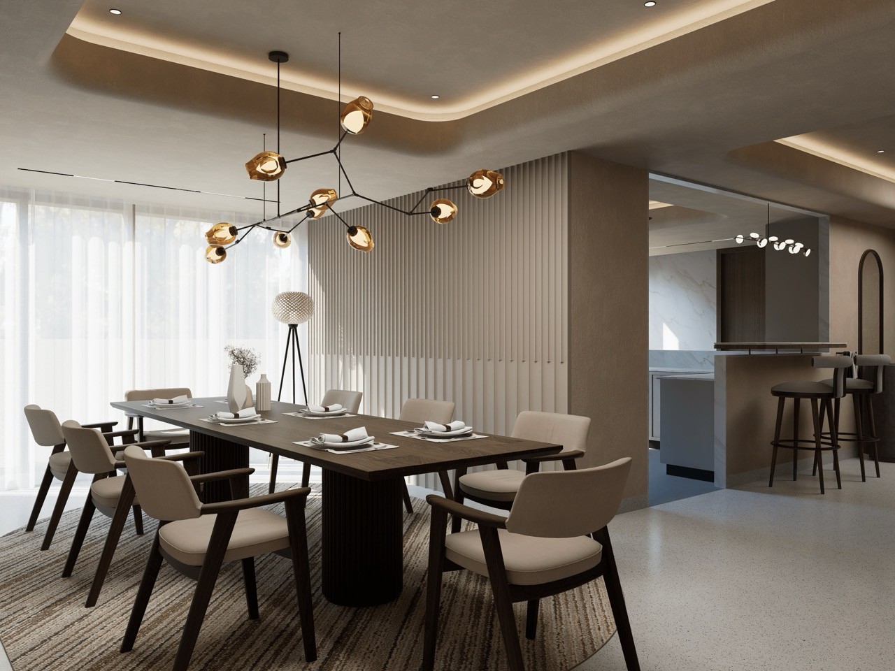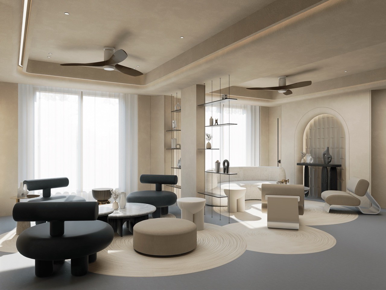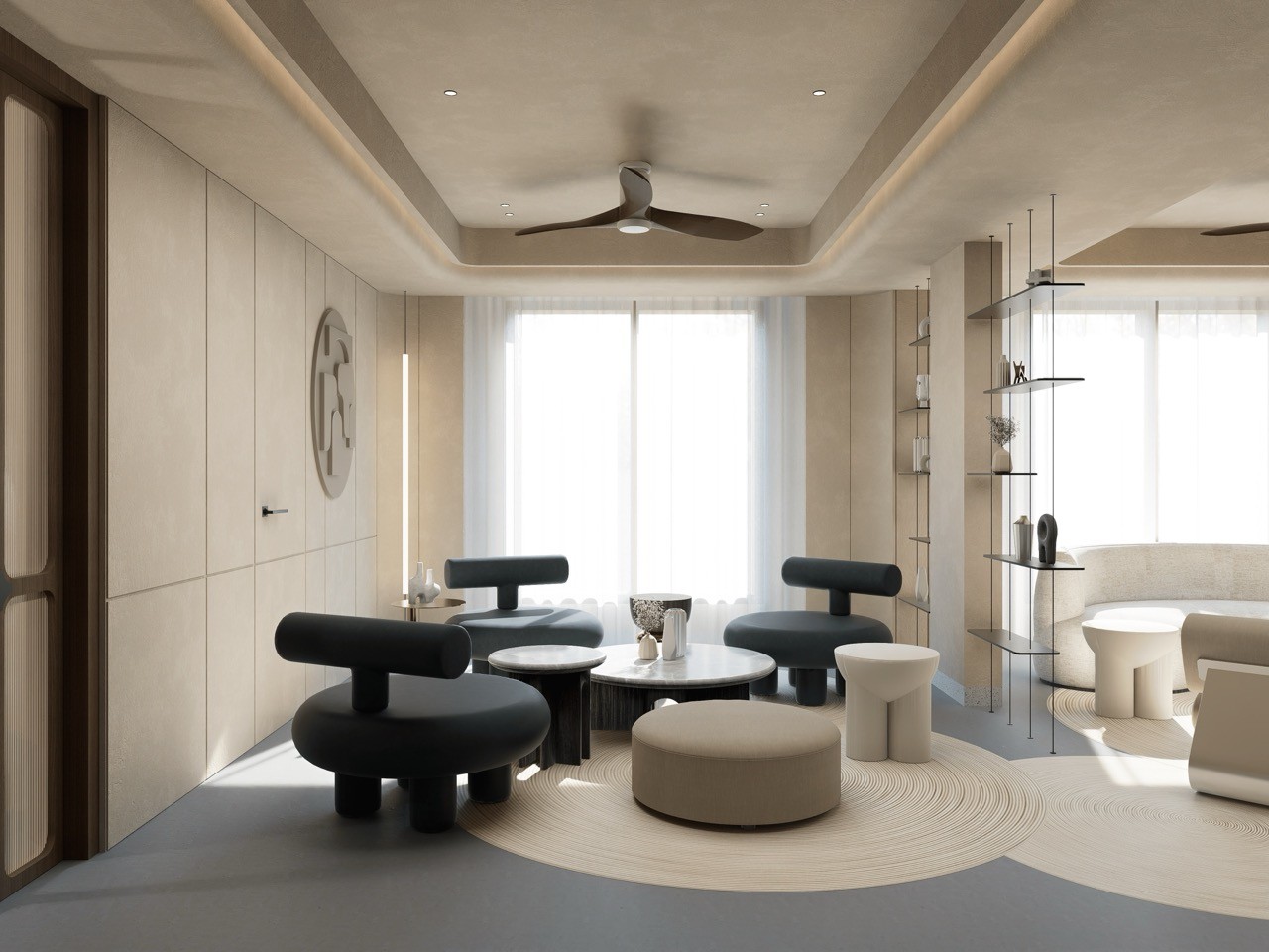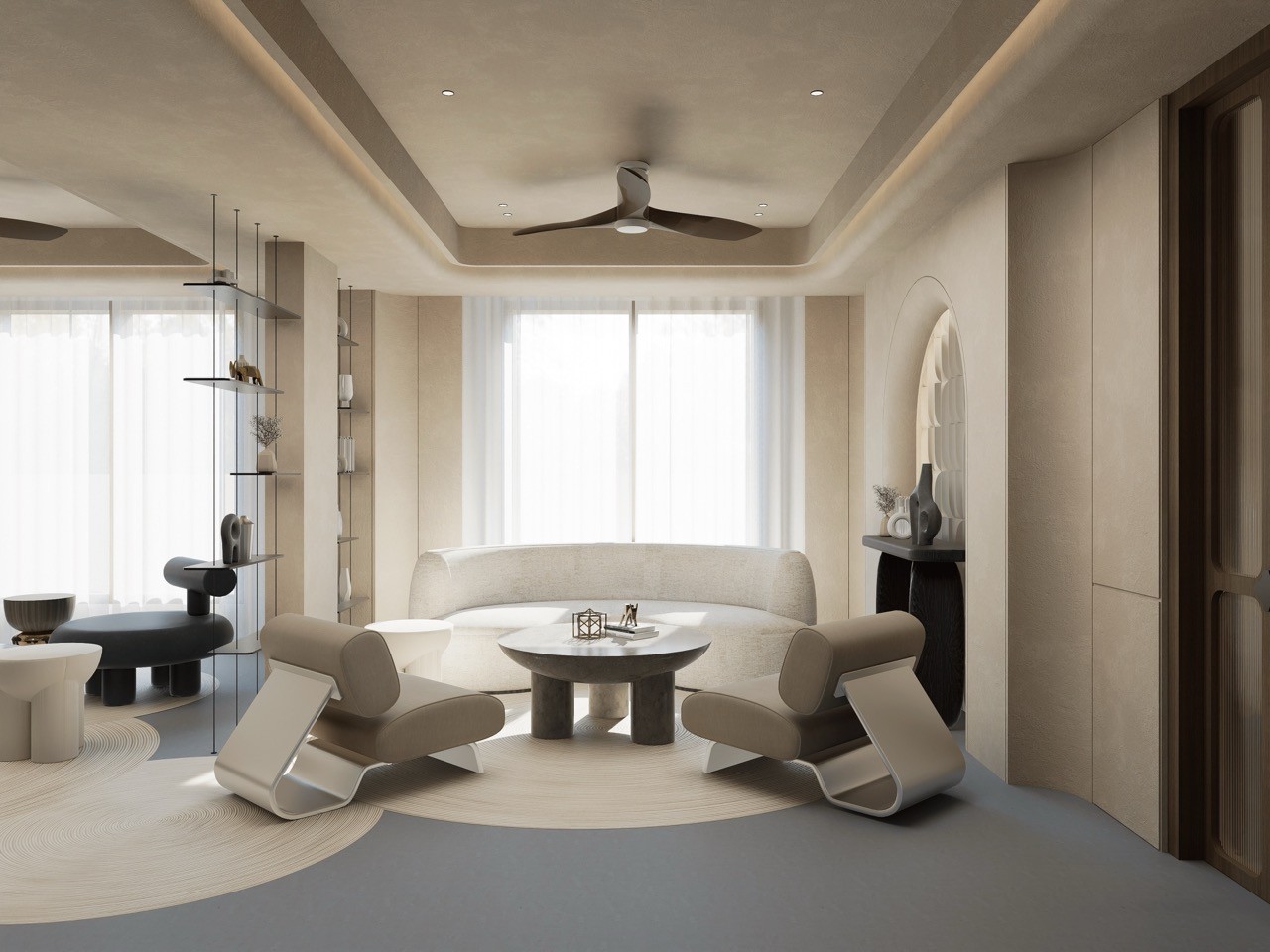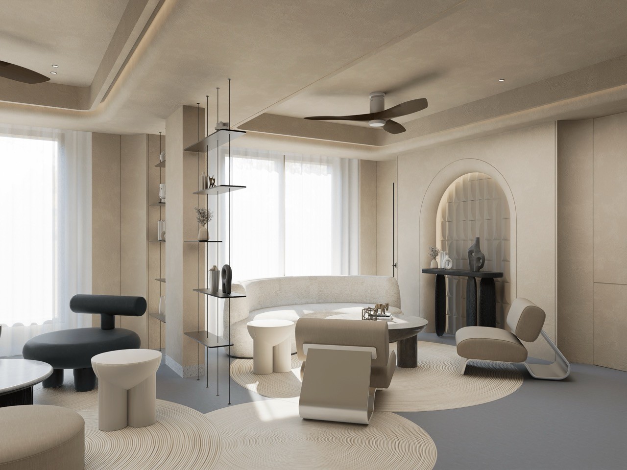 This interior design exudes elegance with its warm, neutral palette of beige and soft browns. The curved furniture, including a plush sectional sofa and sculptural lounge chairs, enhances the organic, flowing aesthetic.