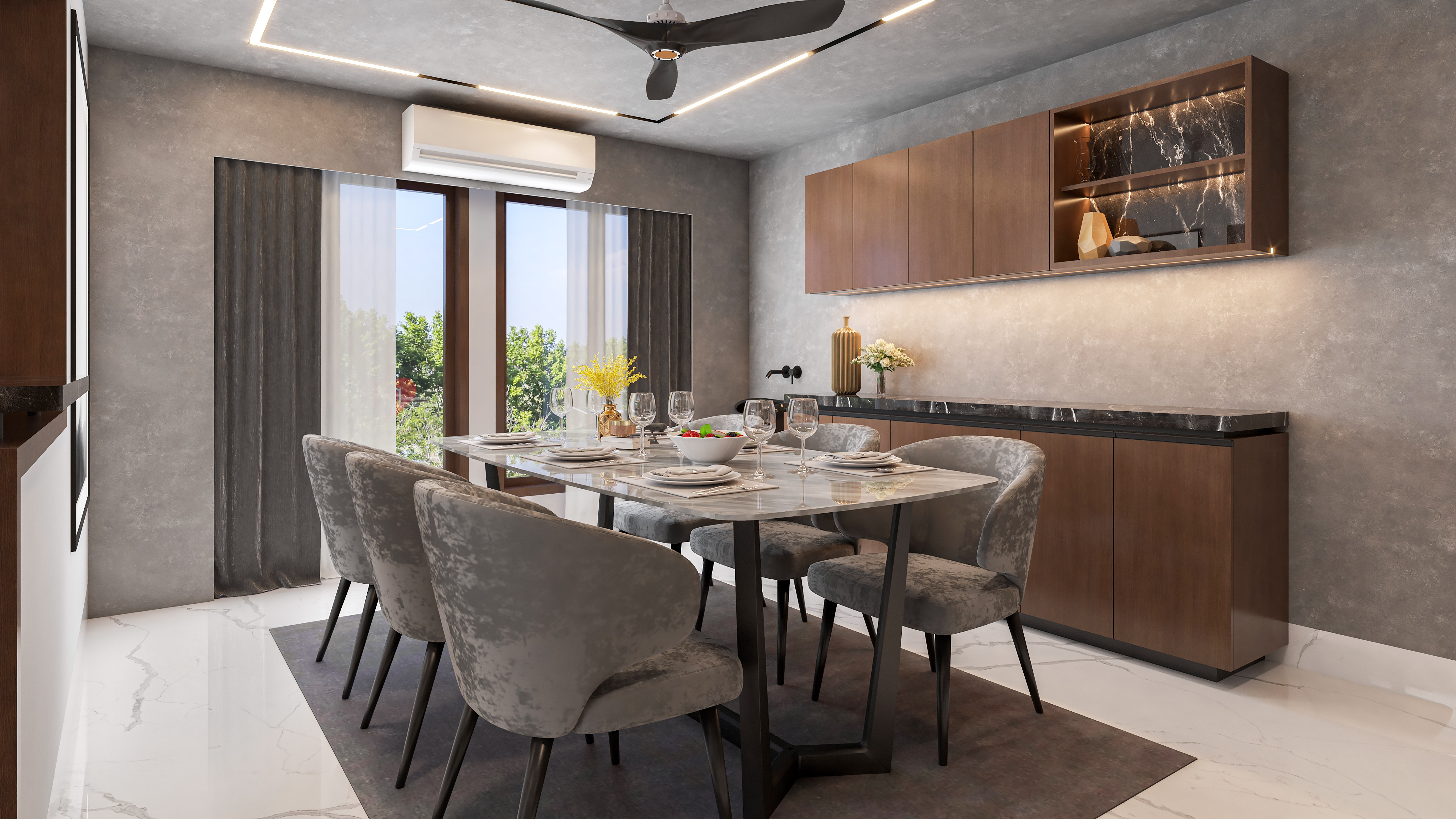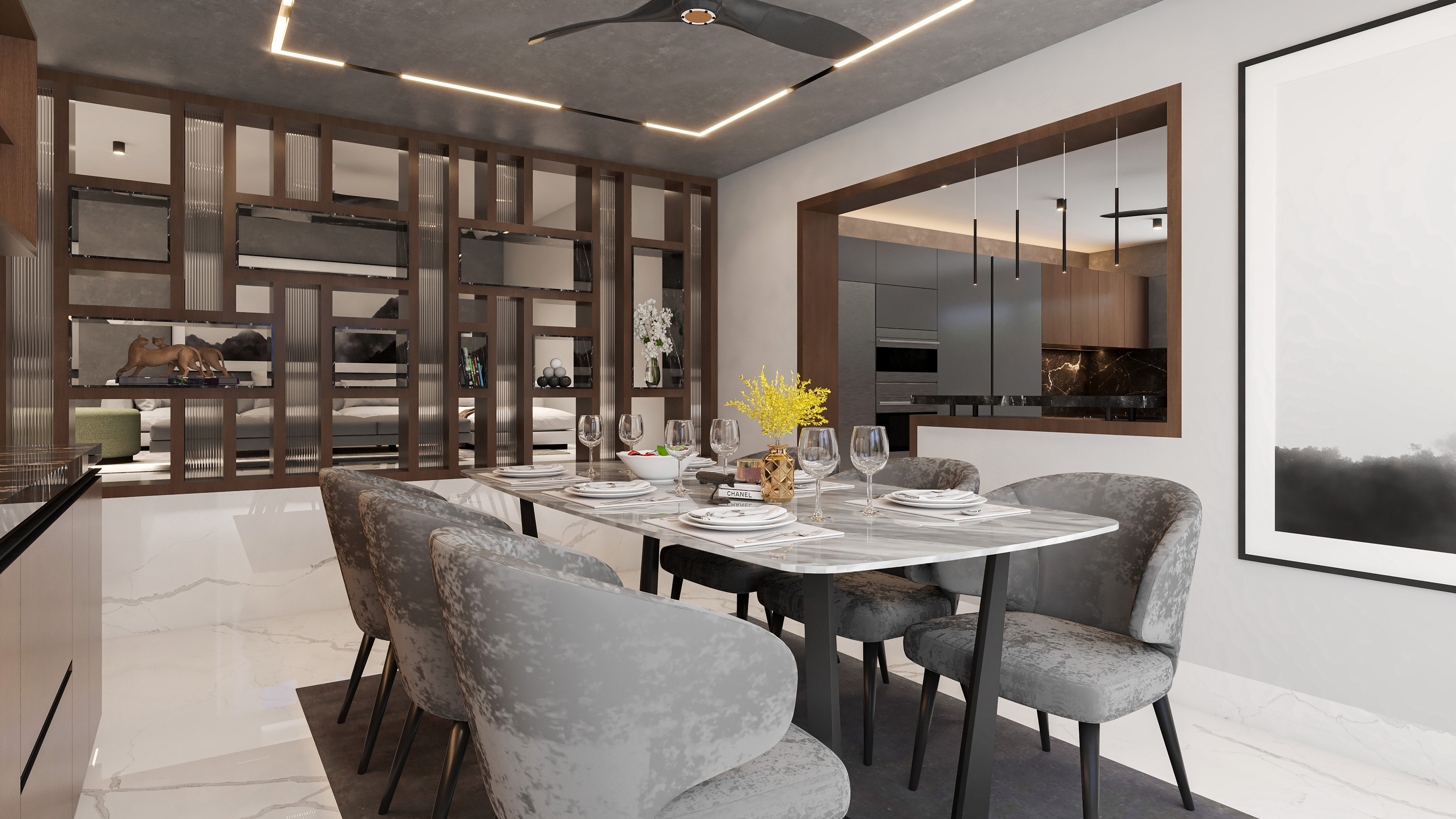 The interior design exudes modern luxury with a sophisticated blend of textures and materials. The dining area features a sleek marble-top table, plush velvet chairs, and warm wooden accents, complemented by a geometric partition that adds depth and elegance. The ceiling has embedded LED lighting, enhancing the ambiance.