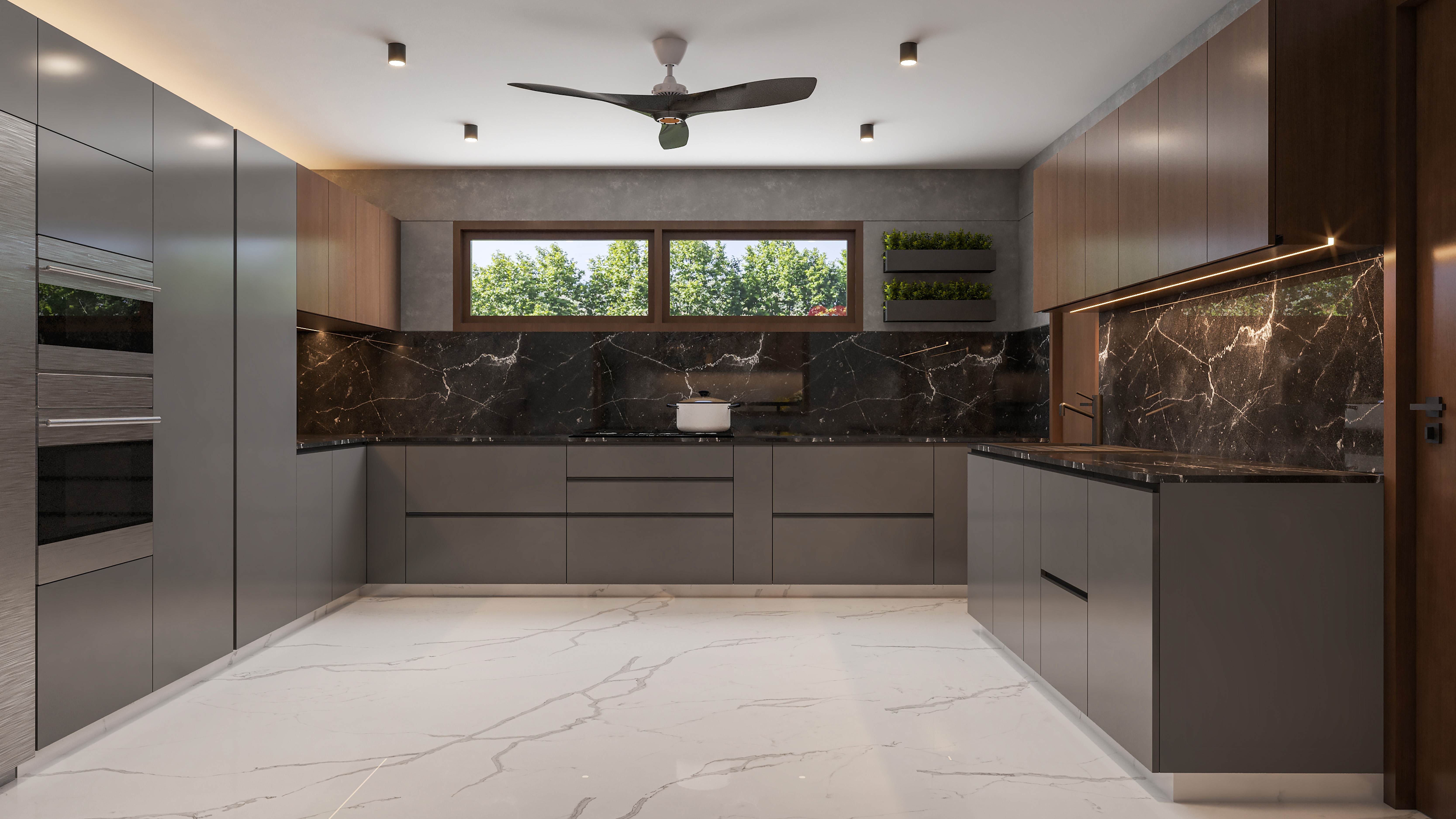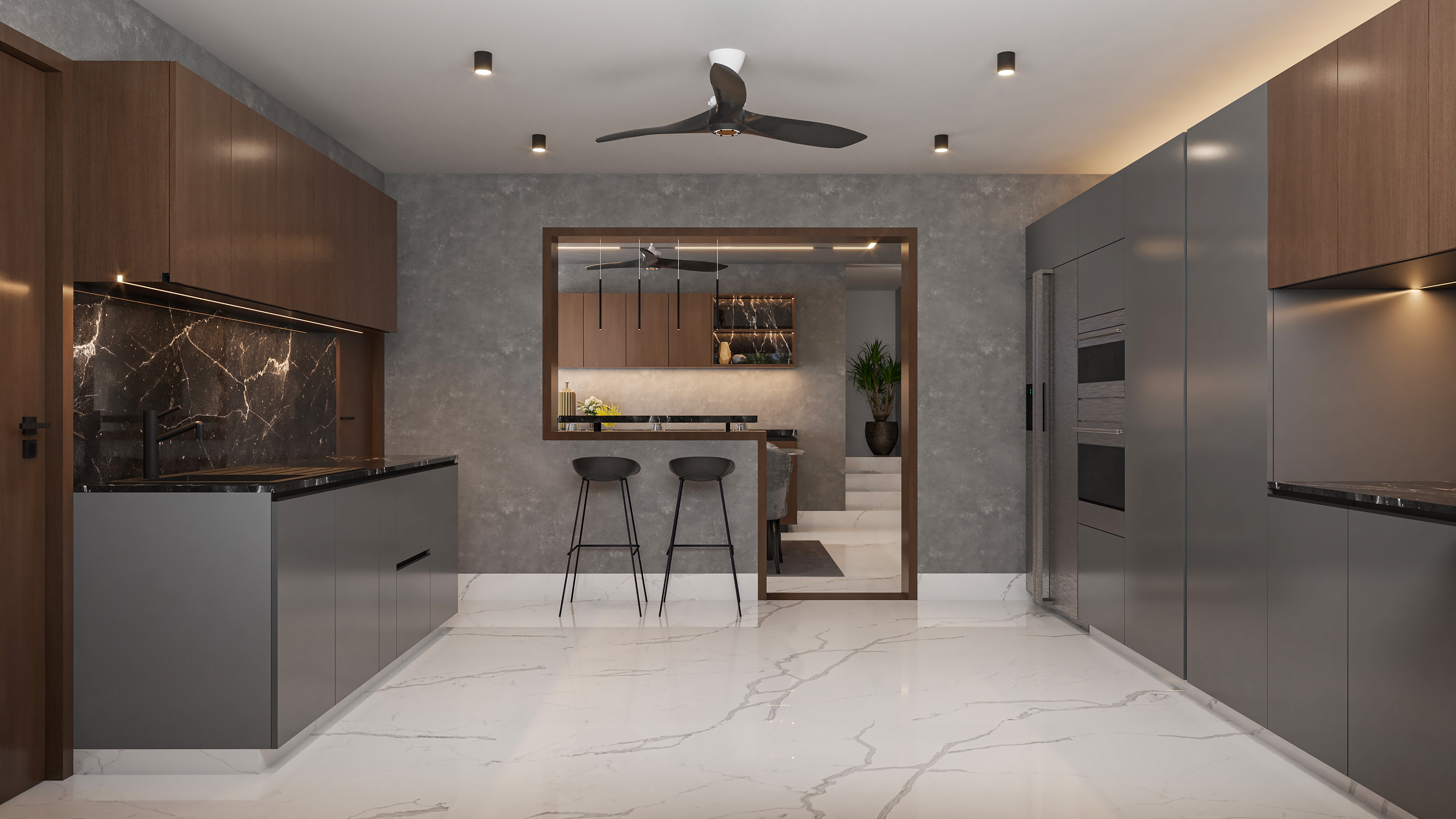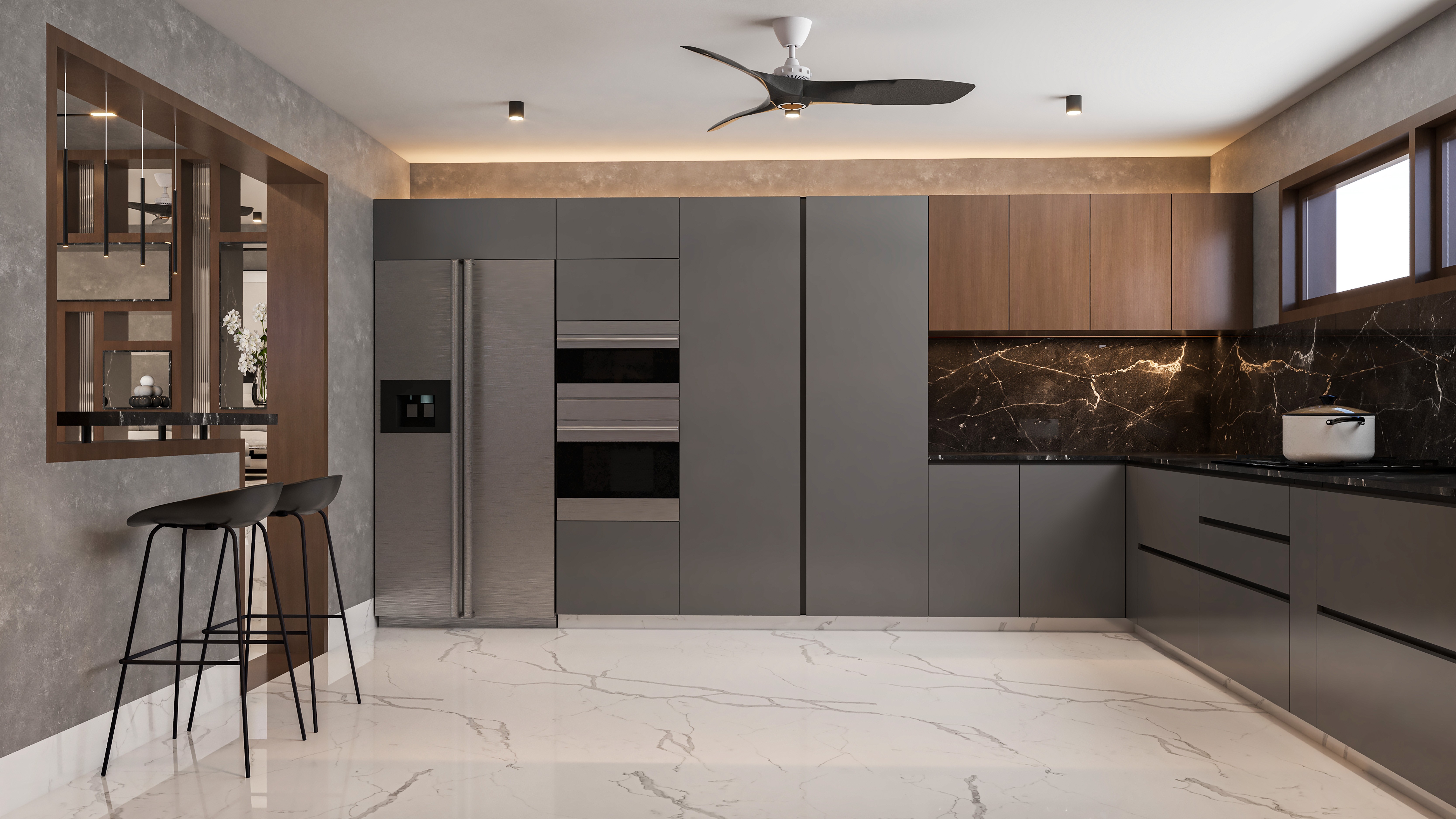 The kitchen follows a contemporary theme with dark grey cabinetry, black marble countertops, and wooden upper cabinets, creating a striking contrast. A large window provides natural light, while under-cabinet lighting adds a refined touch. The open-plan design seamlessly connects both spaces, ensuring functionality while maintaining a stylish, high-end aesthetic.