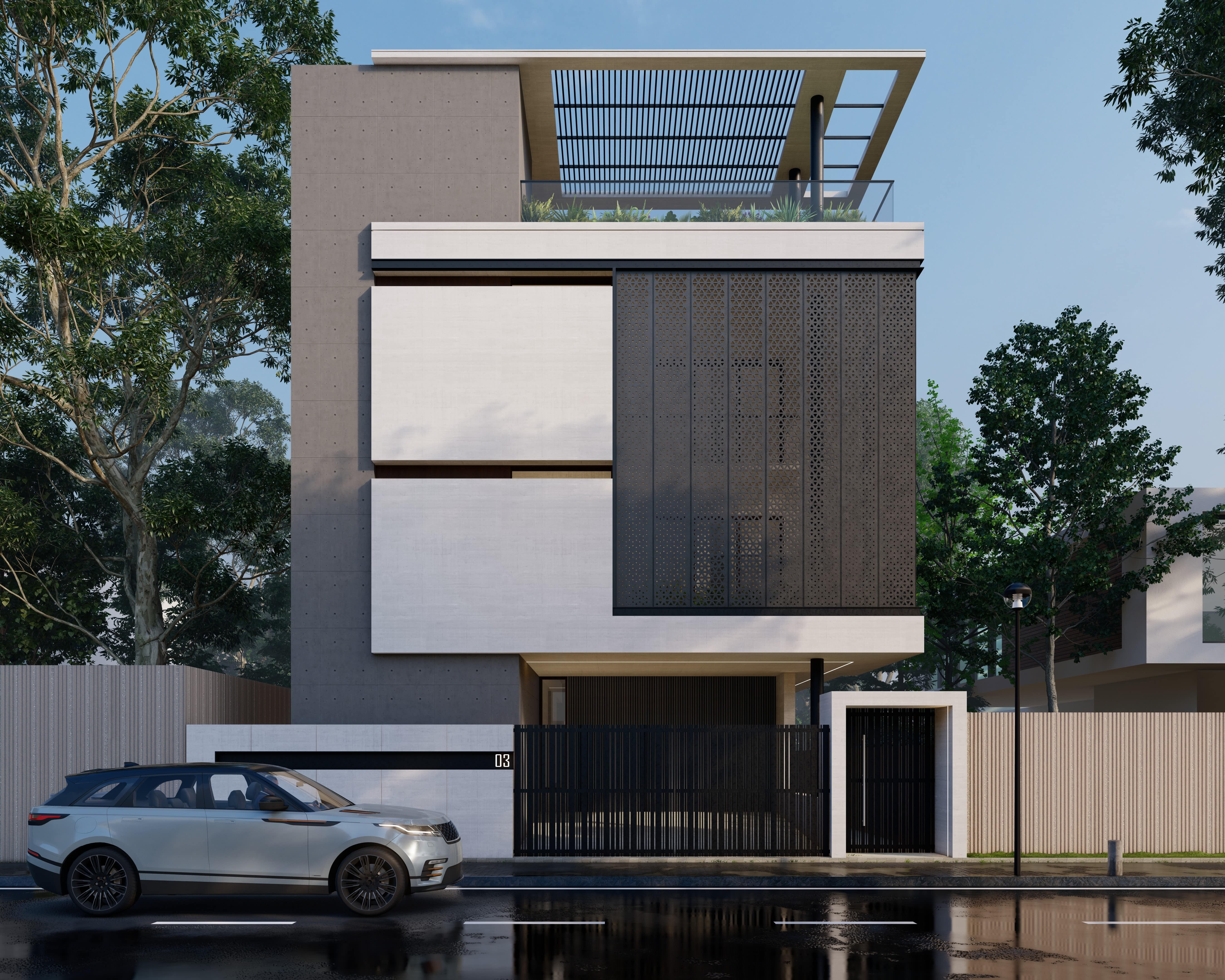 In the alternate version, a perforated metal screen introduces an additional layer of privacy and texture. This screen not only enhances visual interest but also filters light dynamically, adding a sense of movement to the façade. The ground-level entrance is secured with sleek black gates that maintain the design’s consistency while ensuring security.