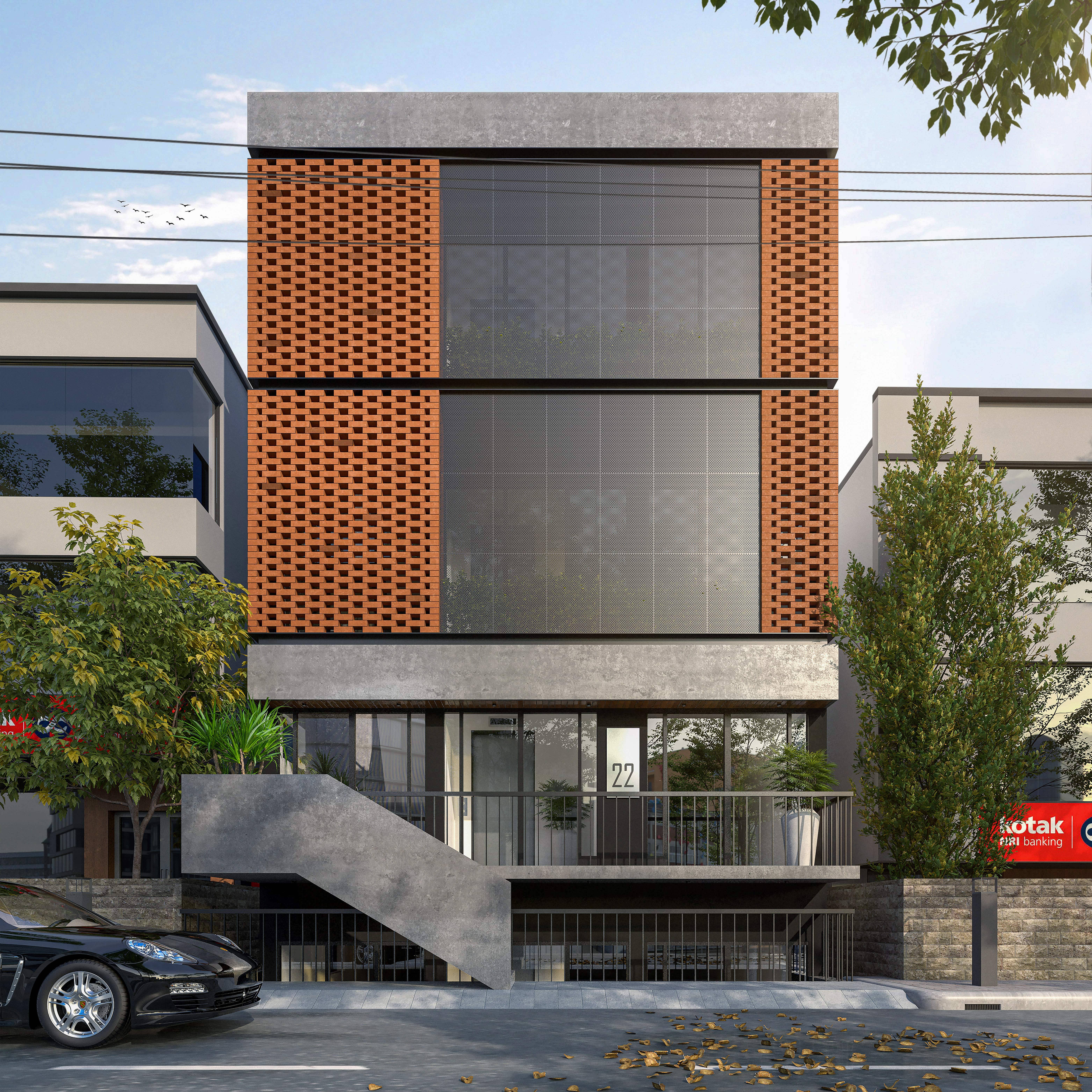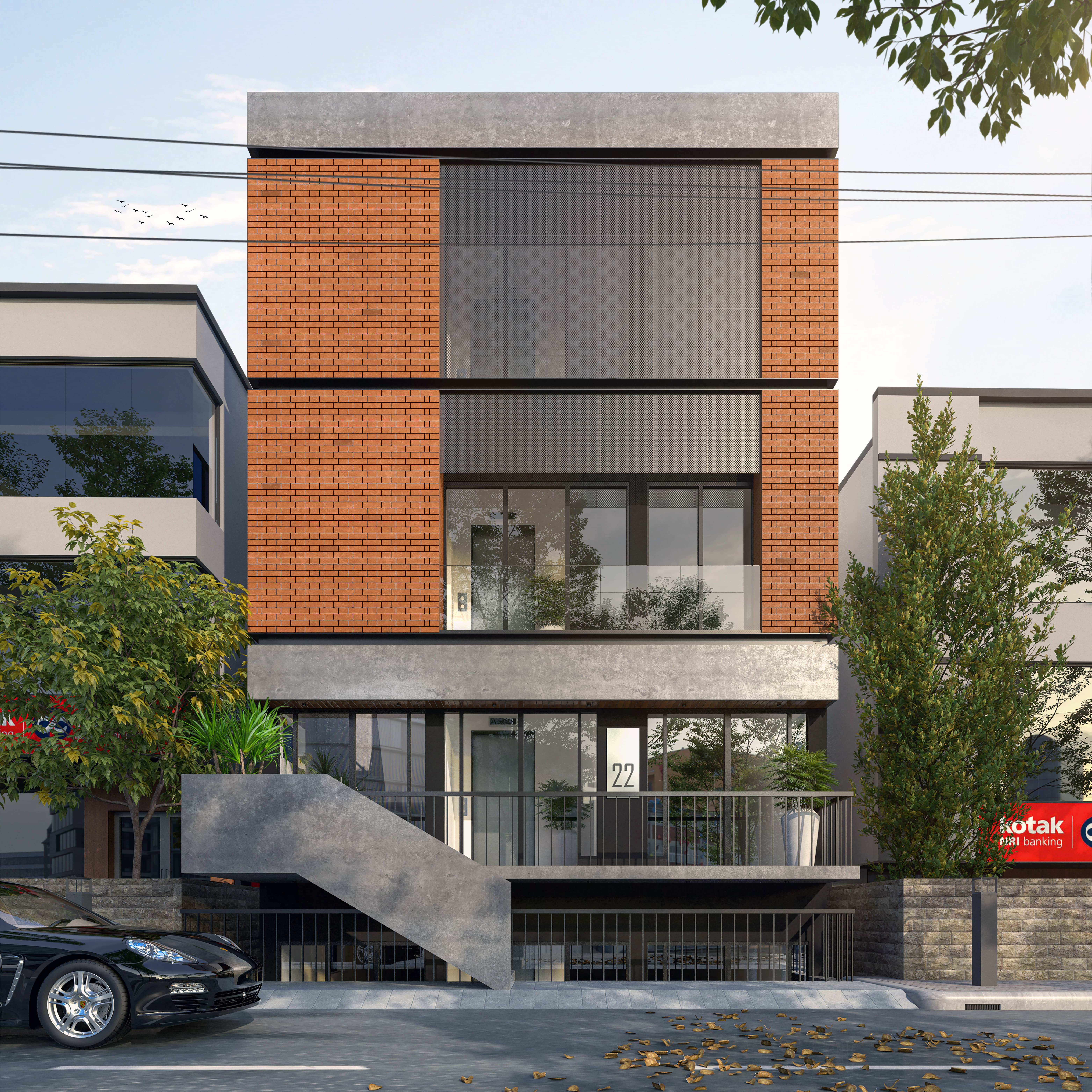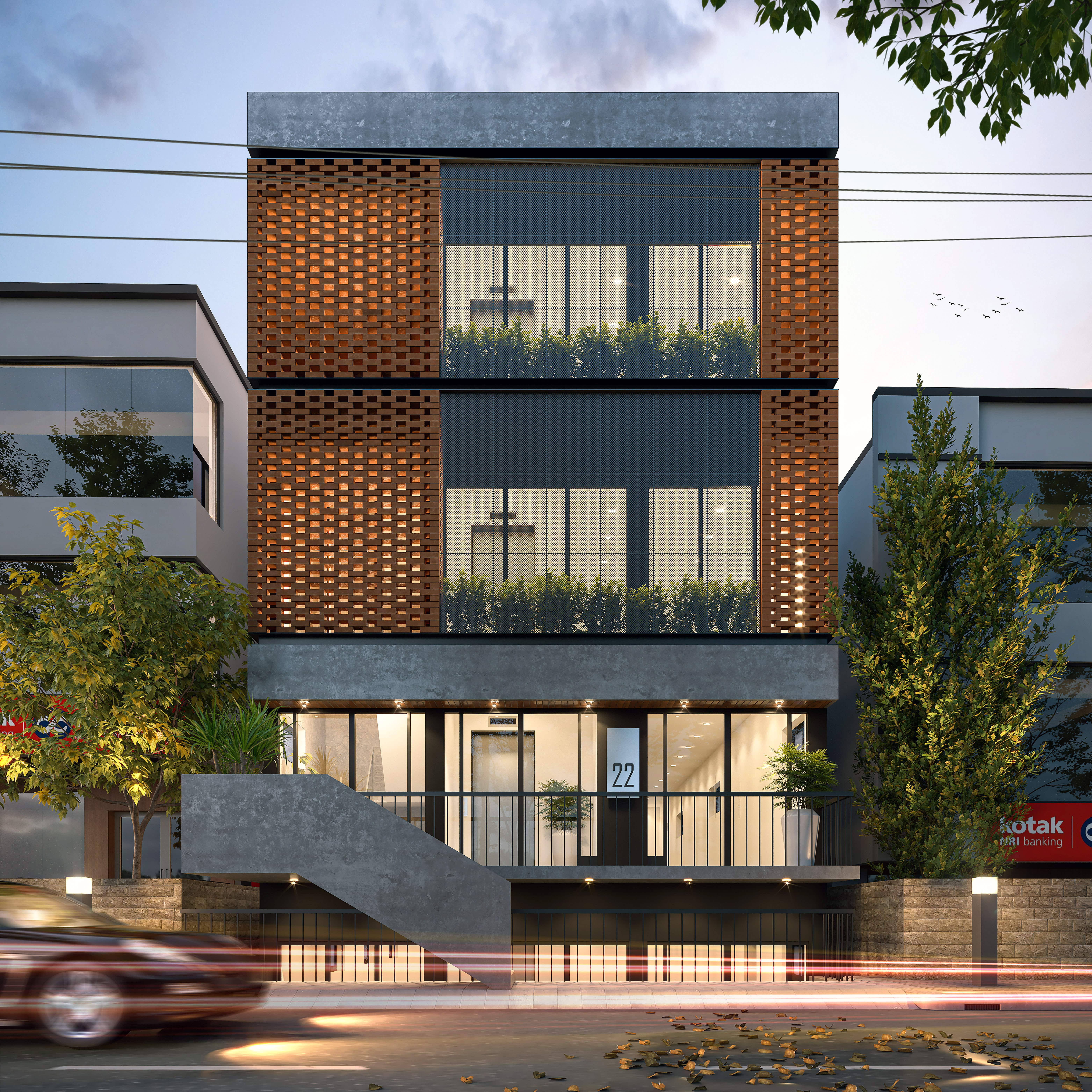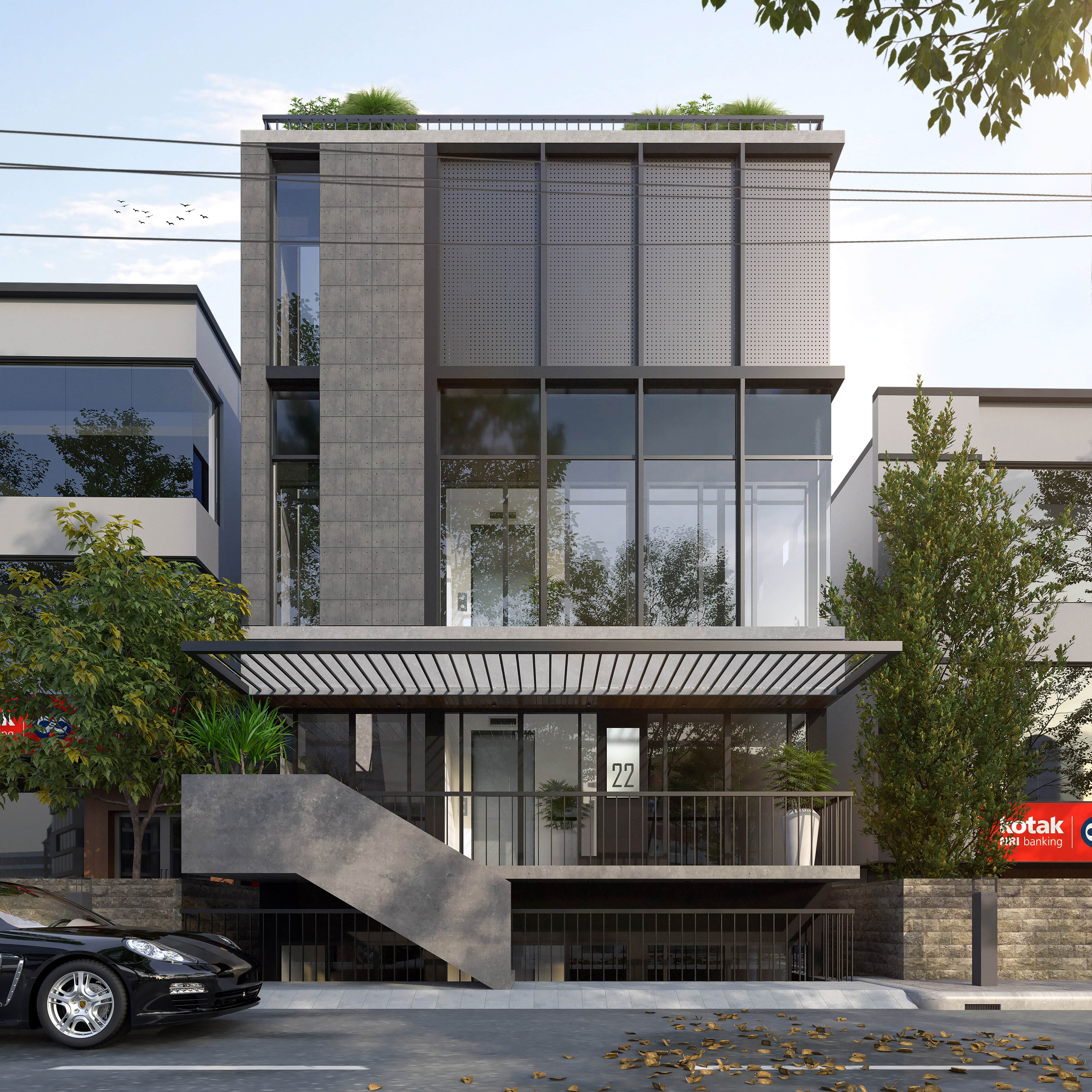 A floating staircase with a solid concrete finish leads to the entrance, seamlessly blending into the structure. The contrast of raw textures, including concrete, glass, and dark panels, adds depth and sophistication.