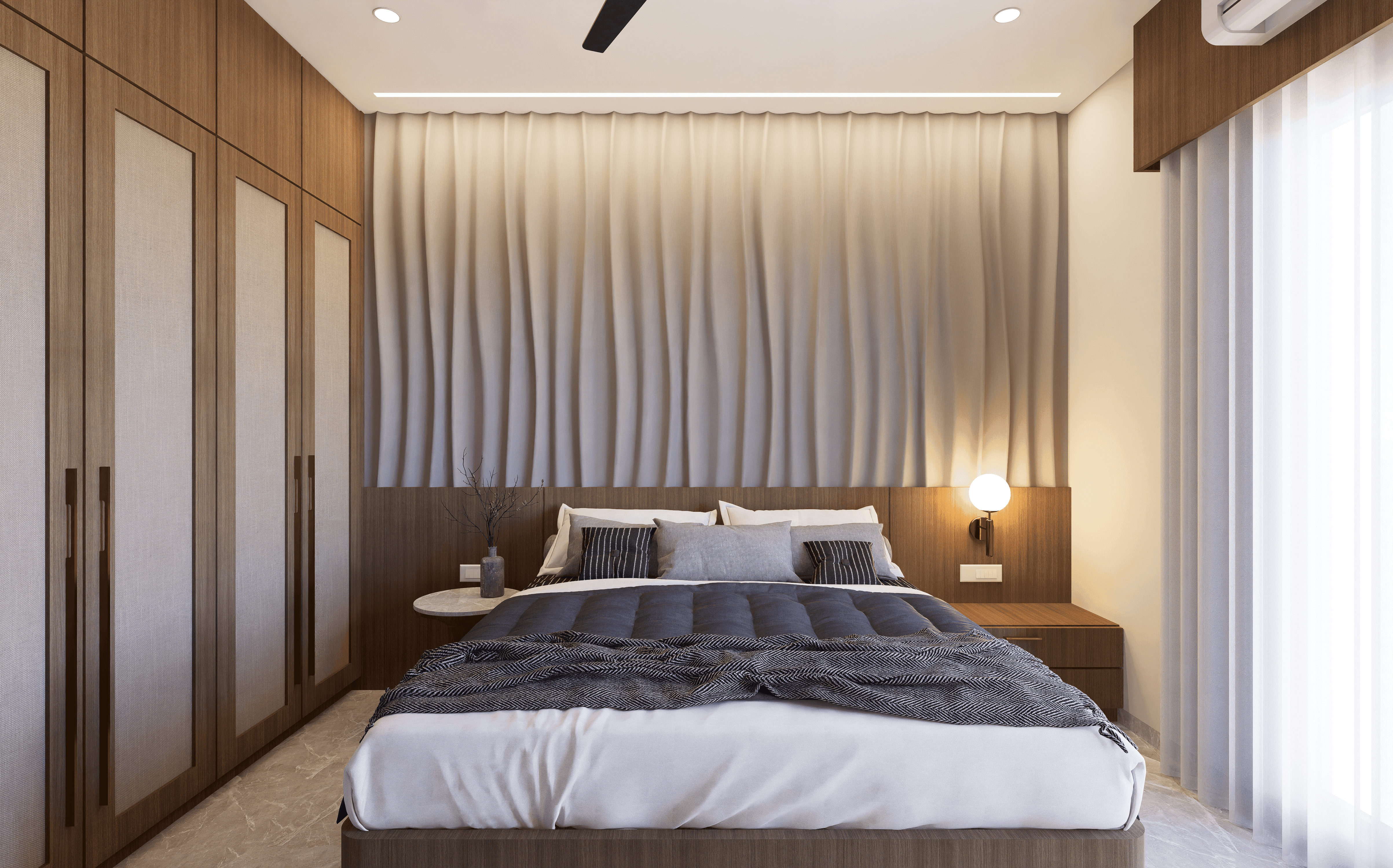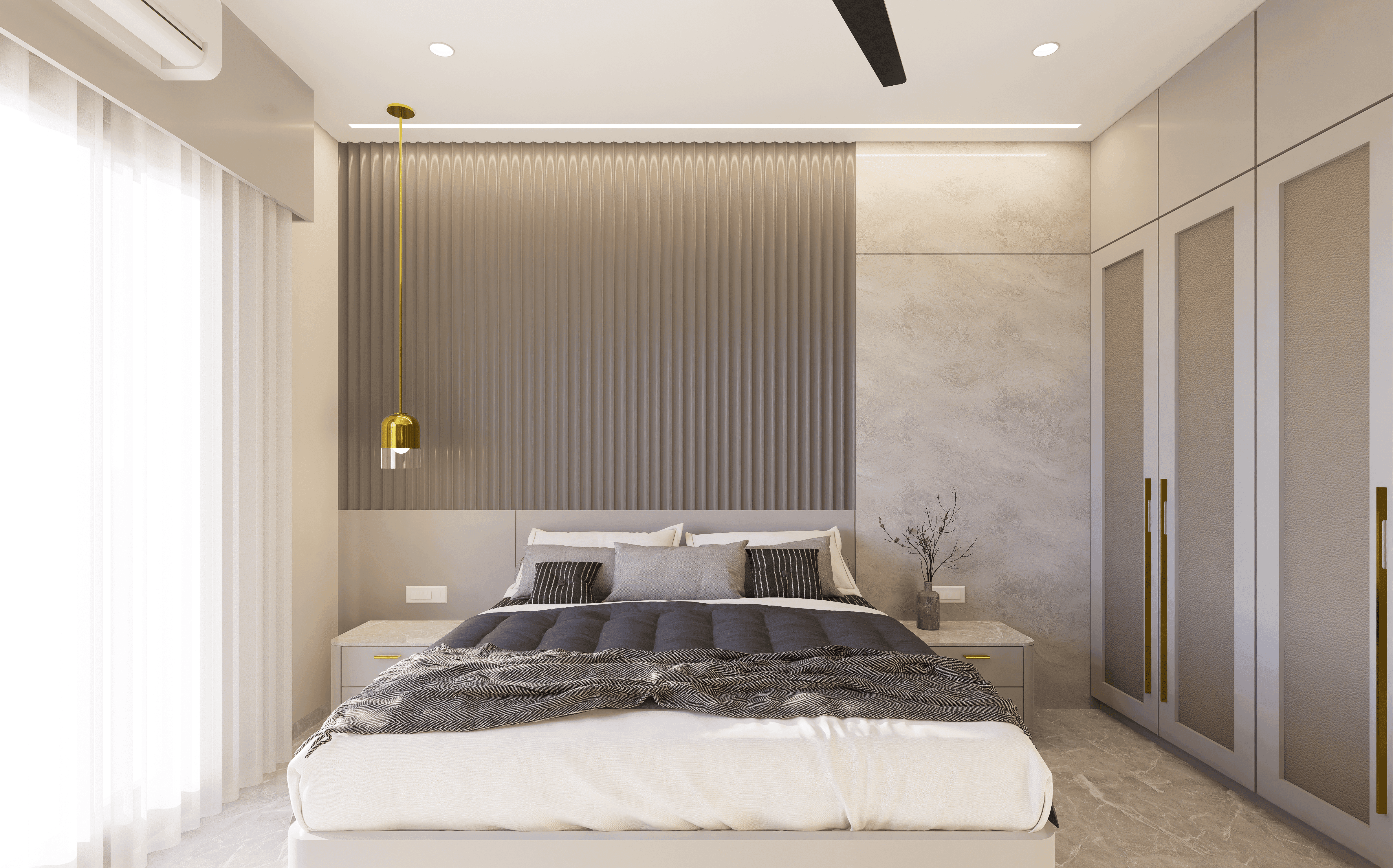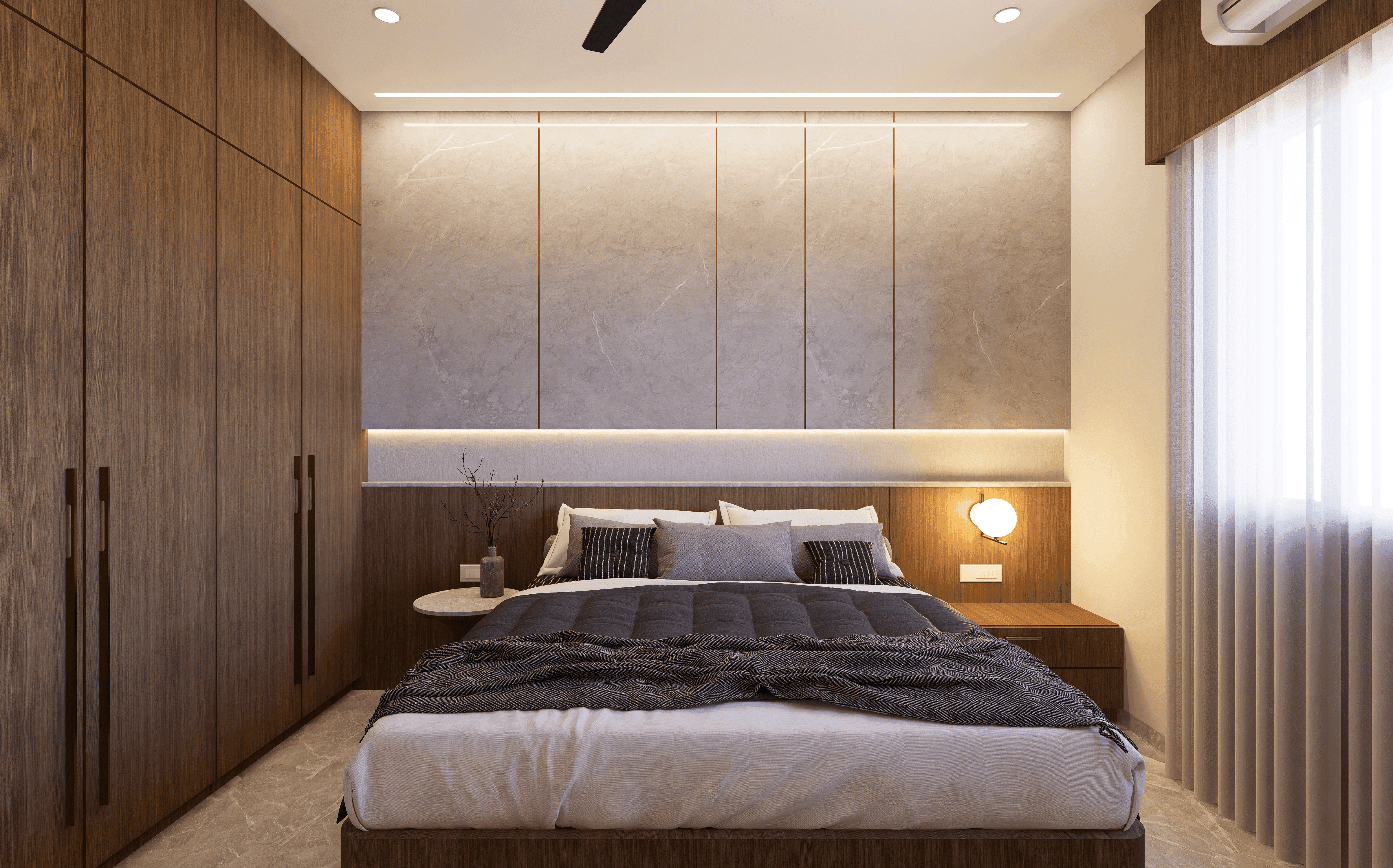 The interiors showcase a sophisticated blend of modern aesthetics and functionality. The bedroom features rich wooden paneling with elegant marble-finish panels, accentuated by soft ambient lighting.