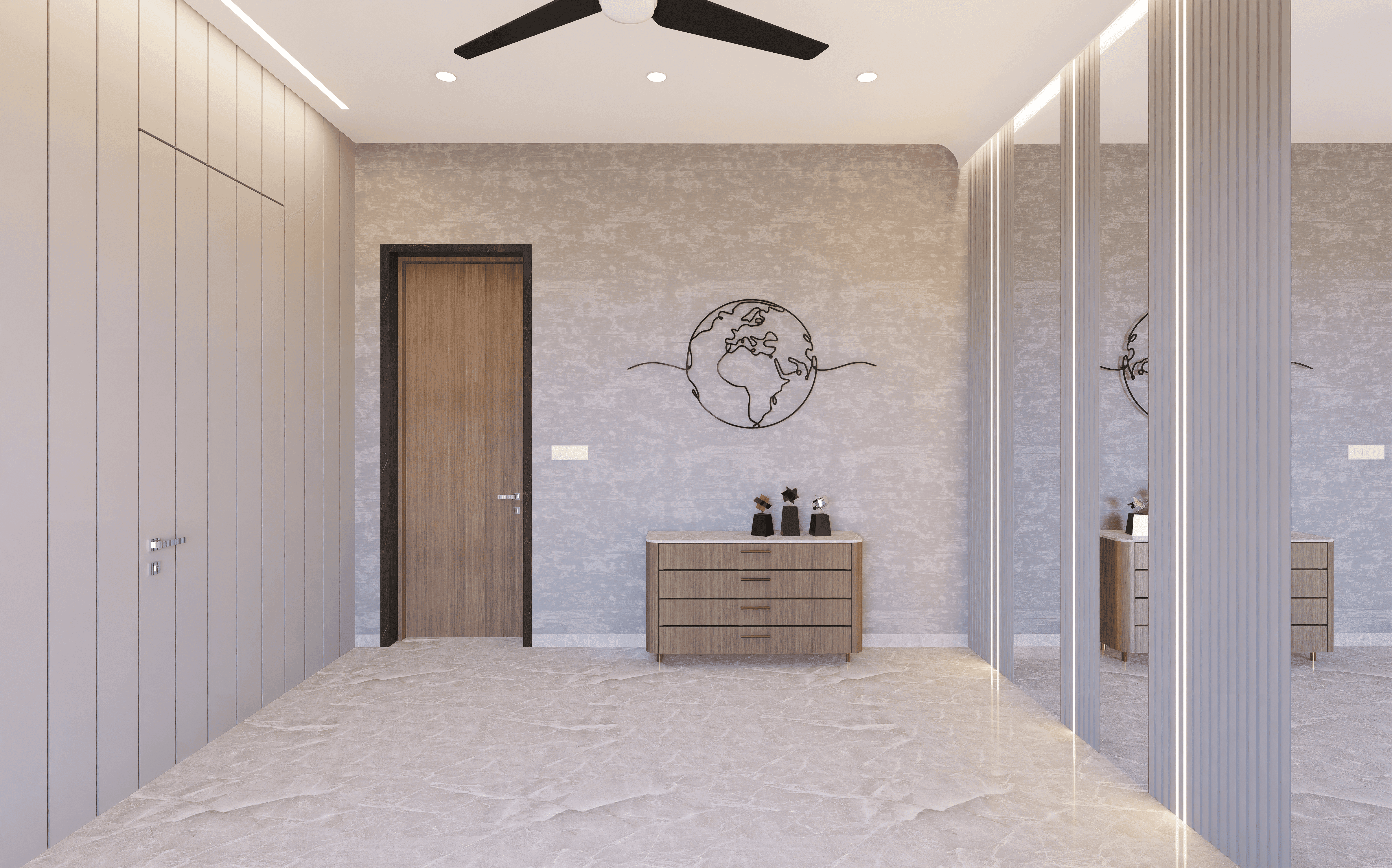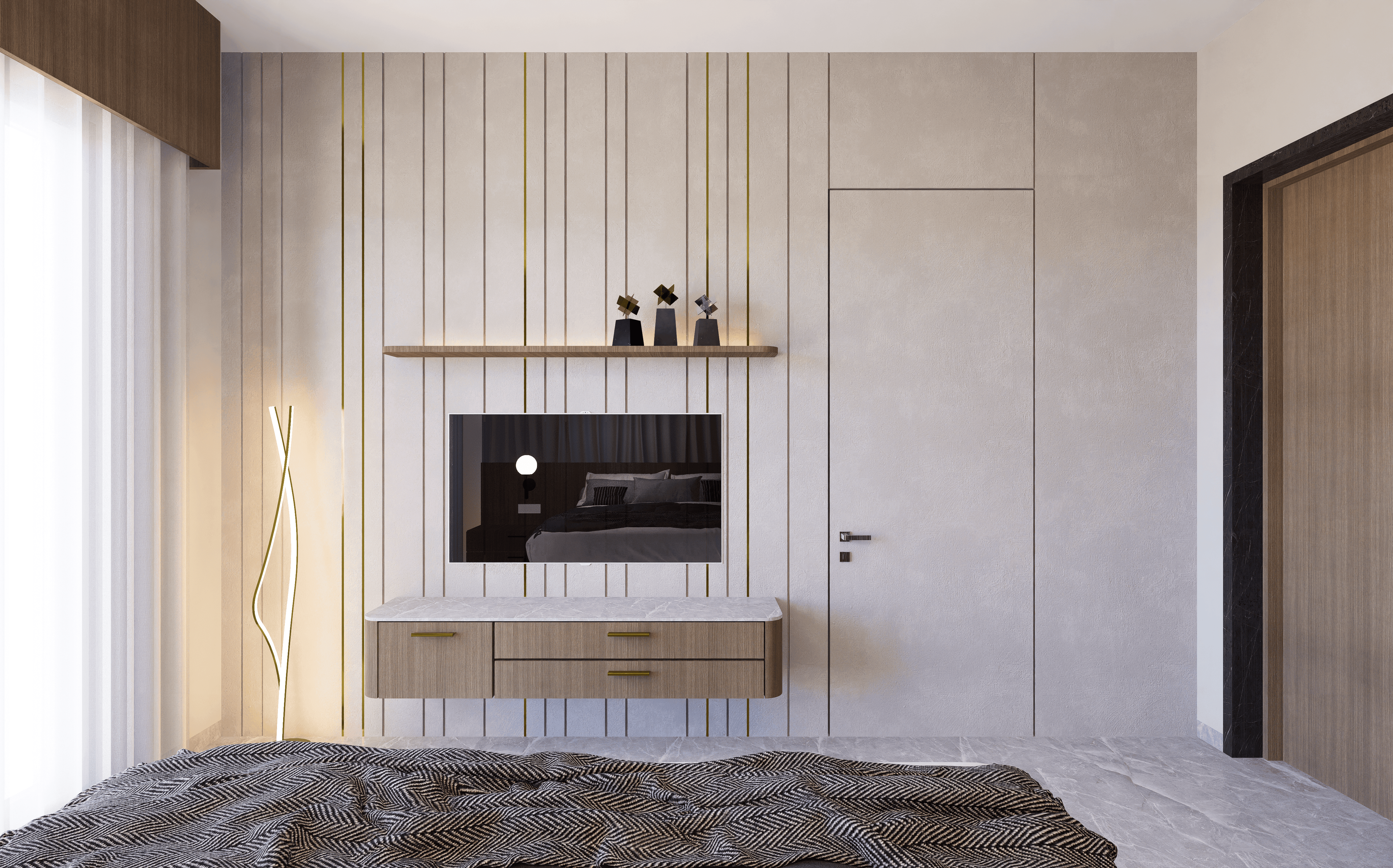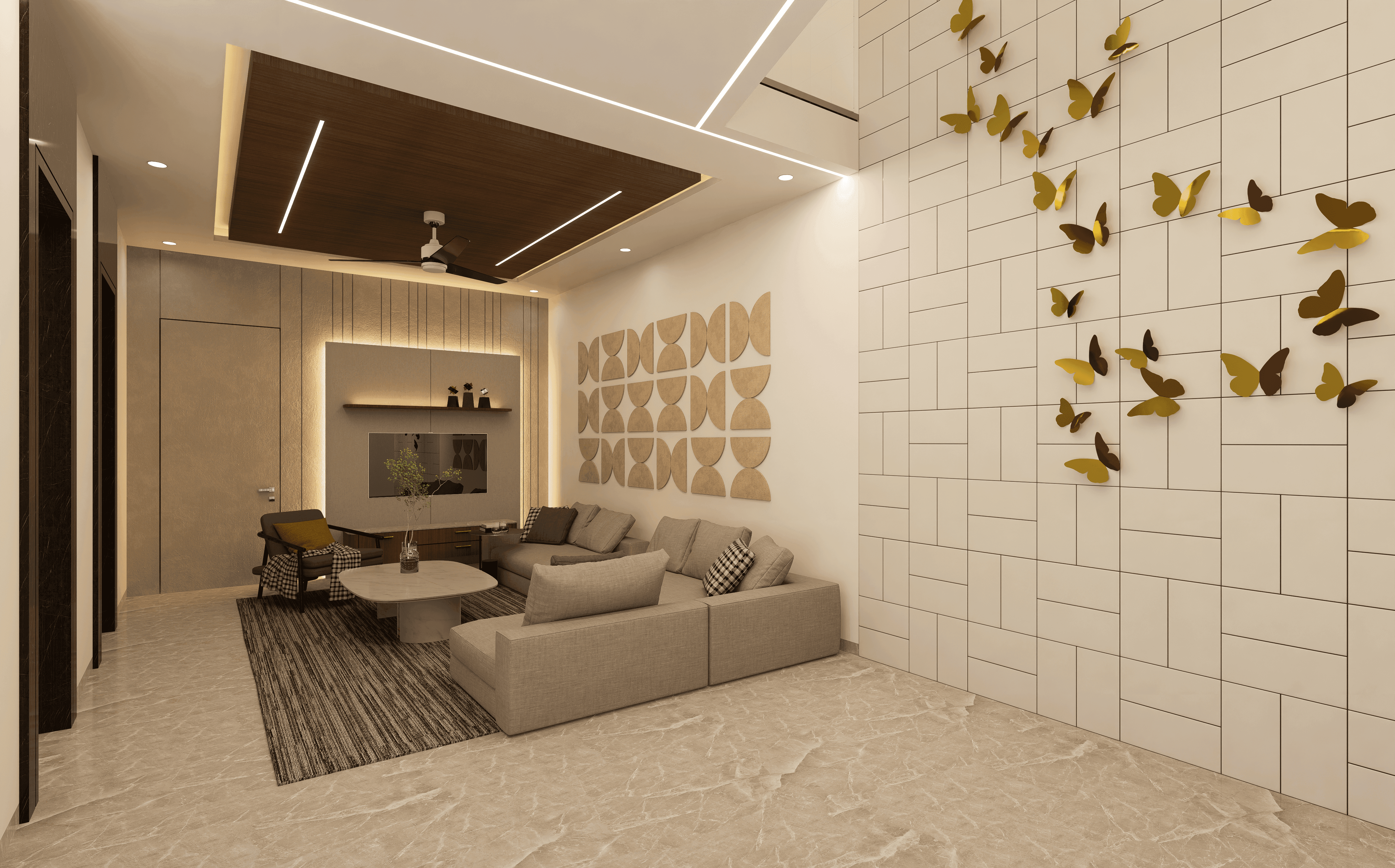 The living space exudes warmth with neutral tones, geometric wall art, and gold butterfly accents adding a dynamic visual. Sleek wardrobes, floating shelves, and contemporary furniture provide seamless storage and enhance space efficiency.