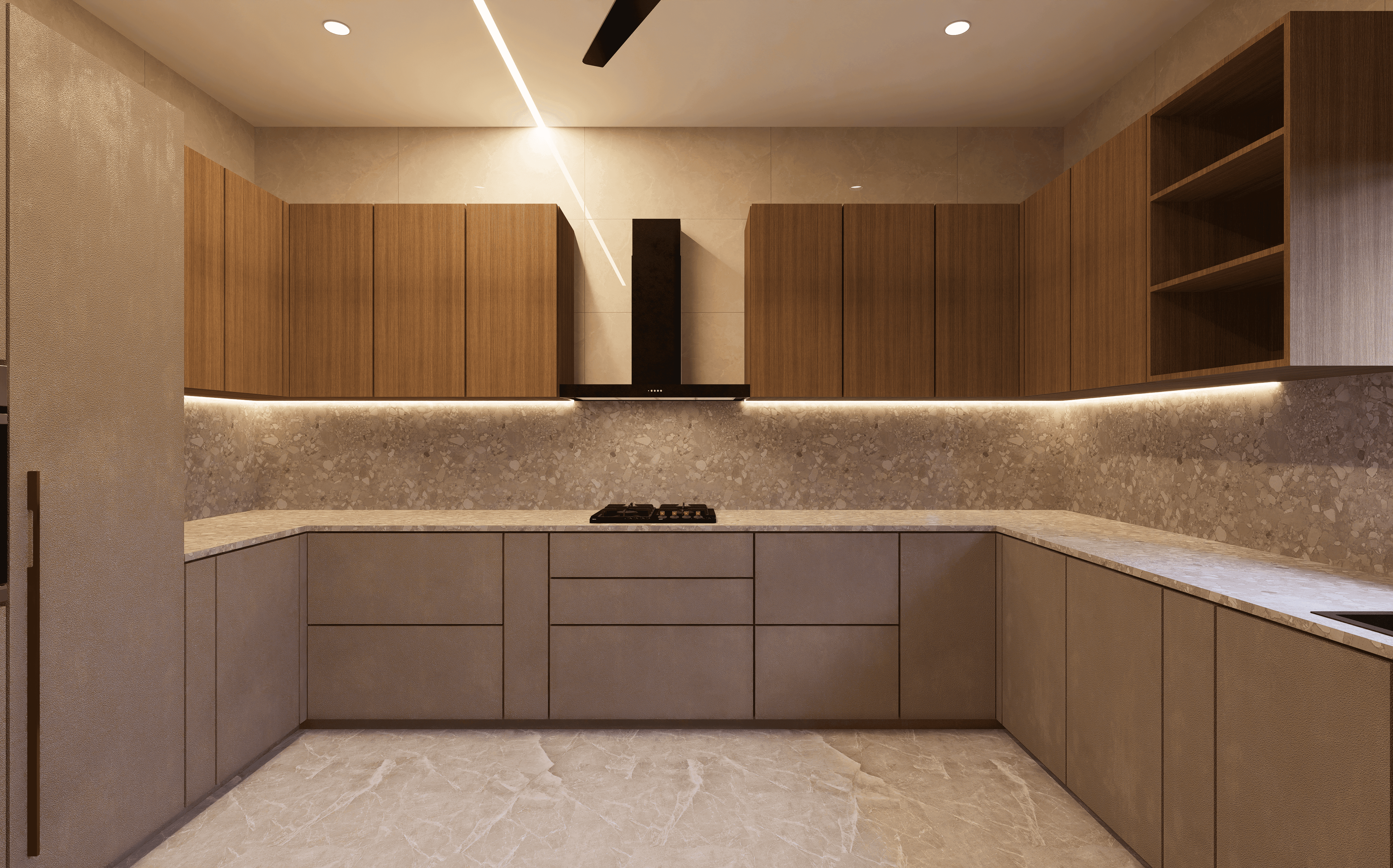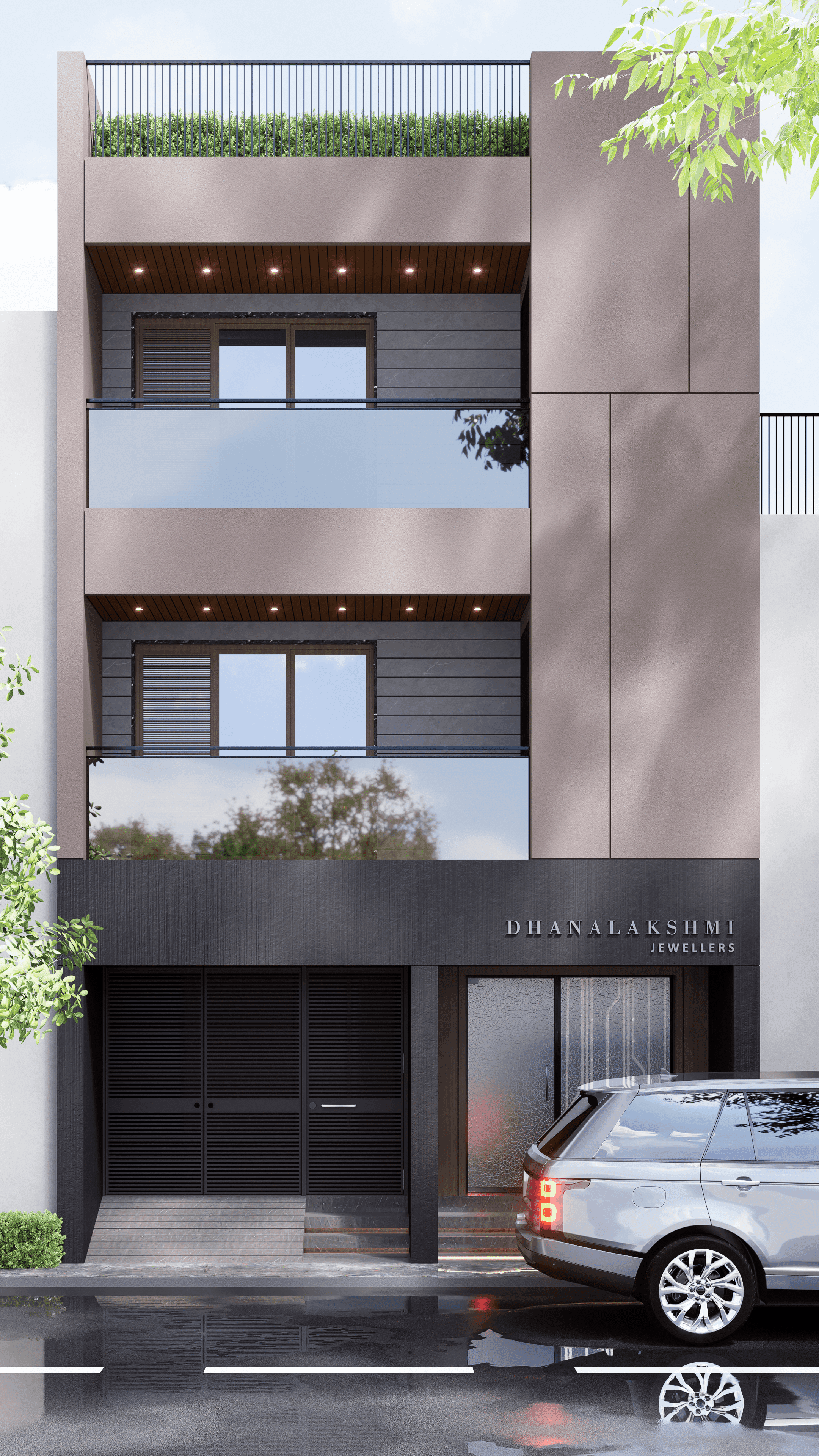 The design features a sleek, modern facade with clean lines and earthy tones. The exterior blends textured finishes with wooden accents, creating a sophisticated look. Glass balconies with metal railings enhance openness, while recessed ceiling lights add warmth.