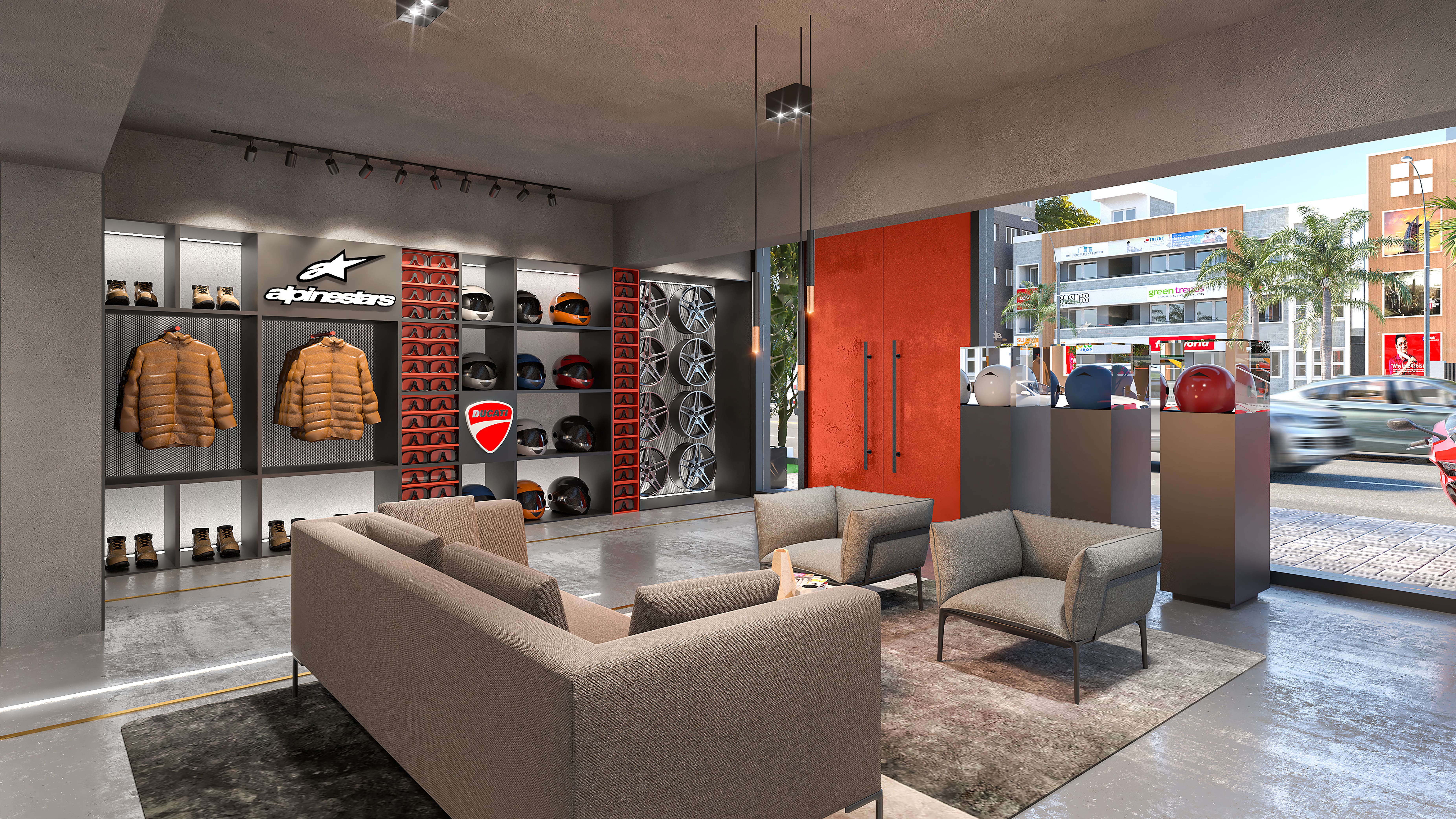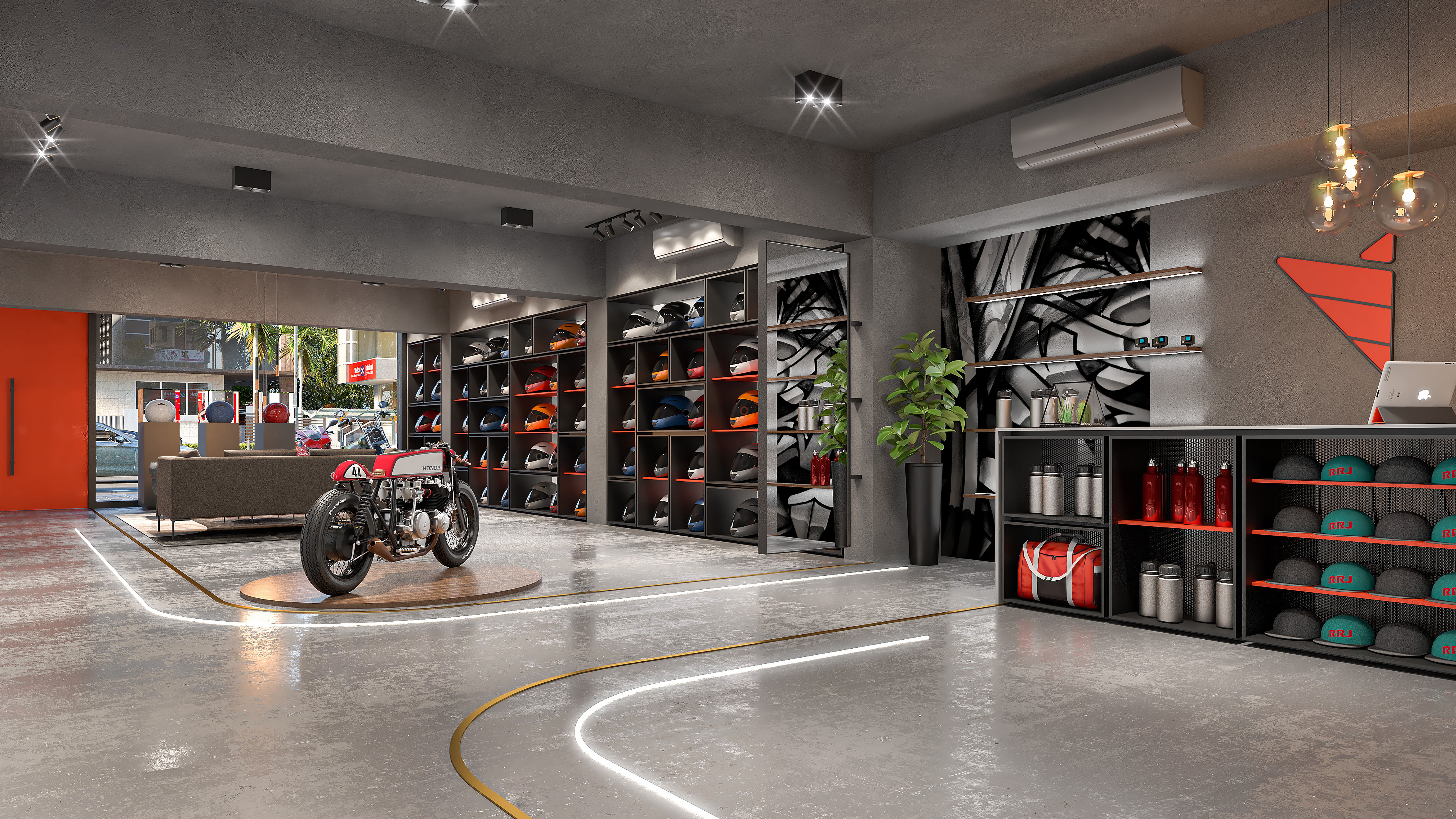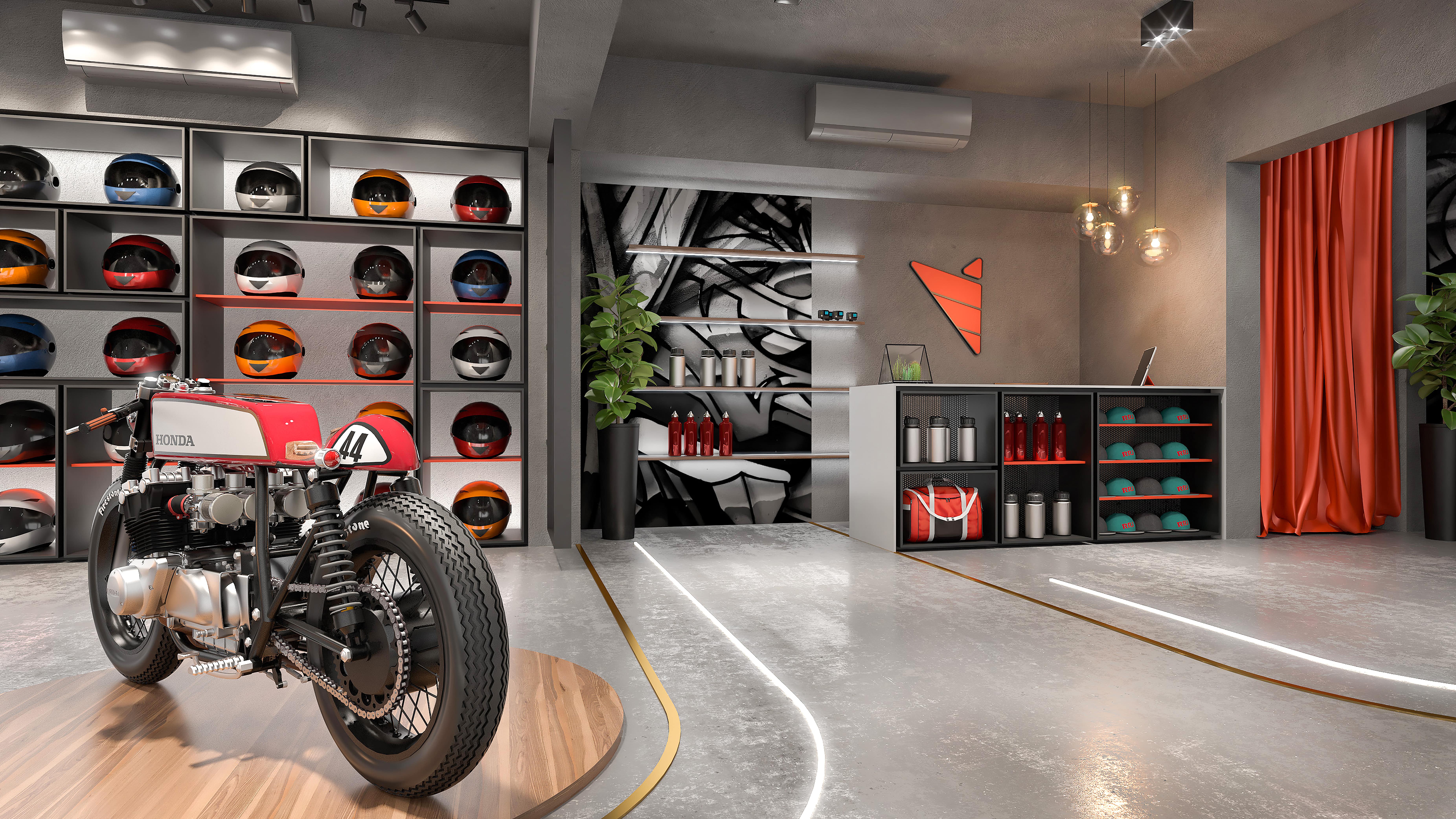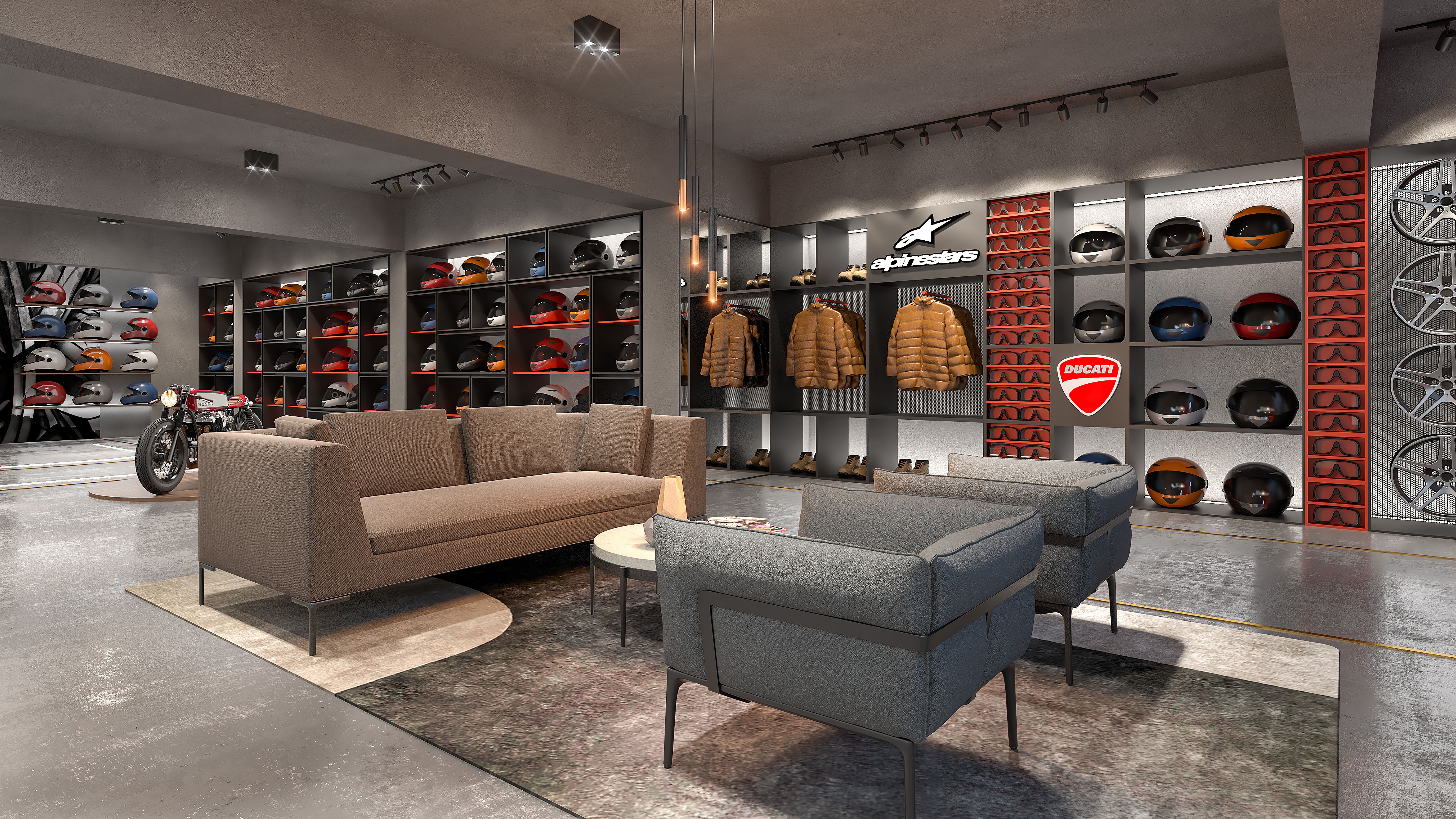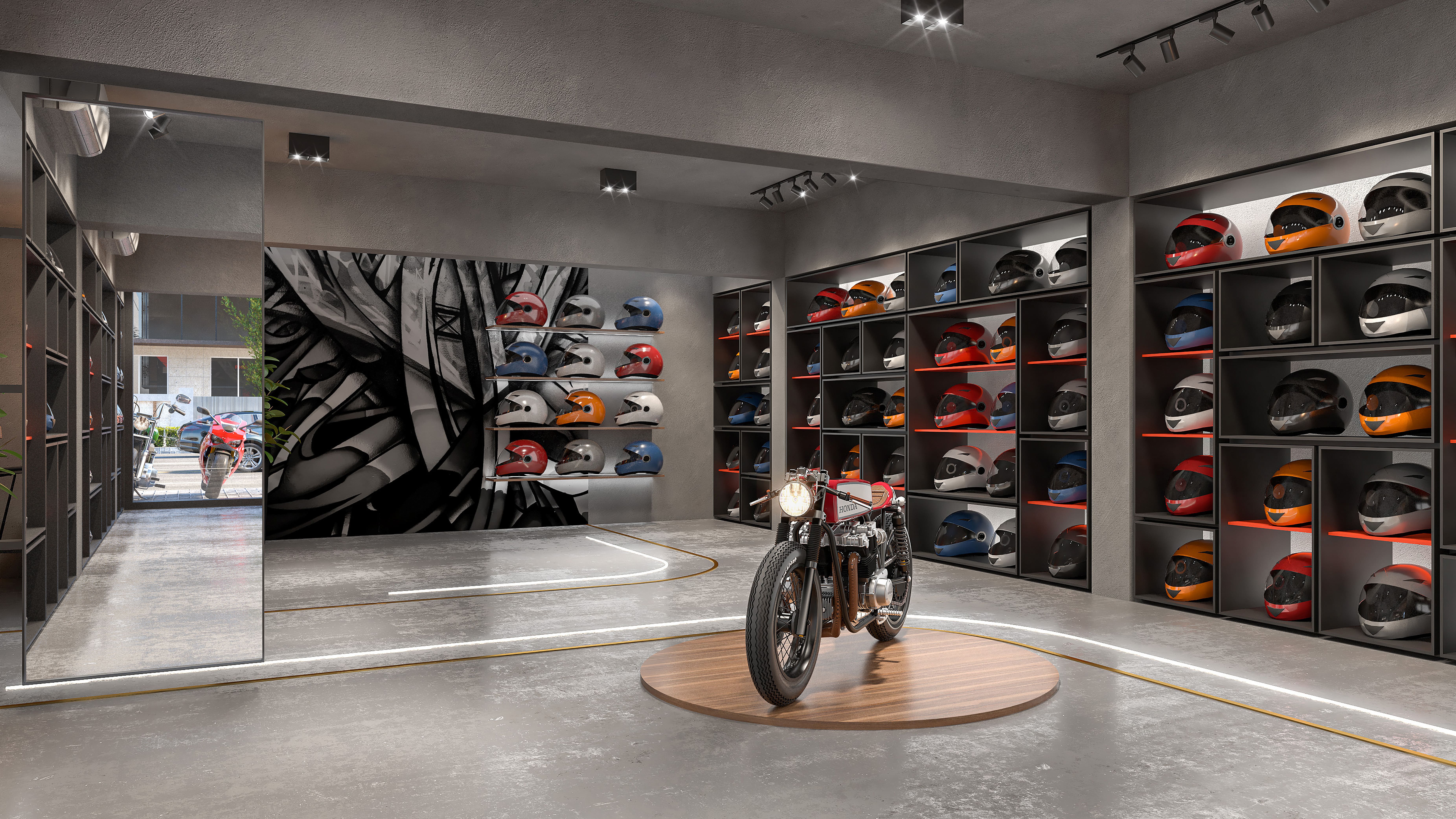 This interior showcases an industrial-modern design with a bold, masculine aesthetic. The concrete flooring and ceiling create a raw, urban feel, while the sleek, black-framed helmet display wall serves as a striking focal point.