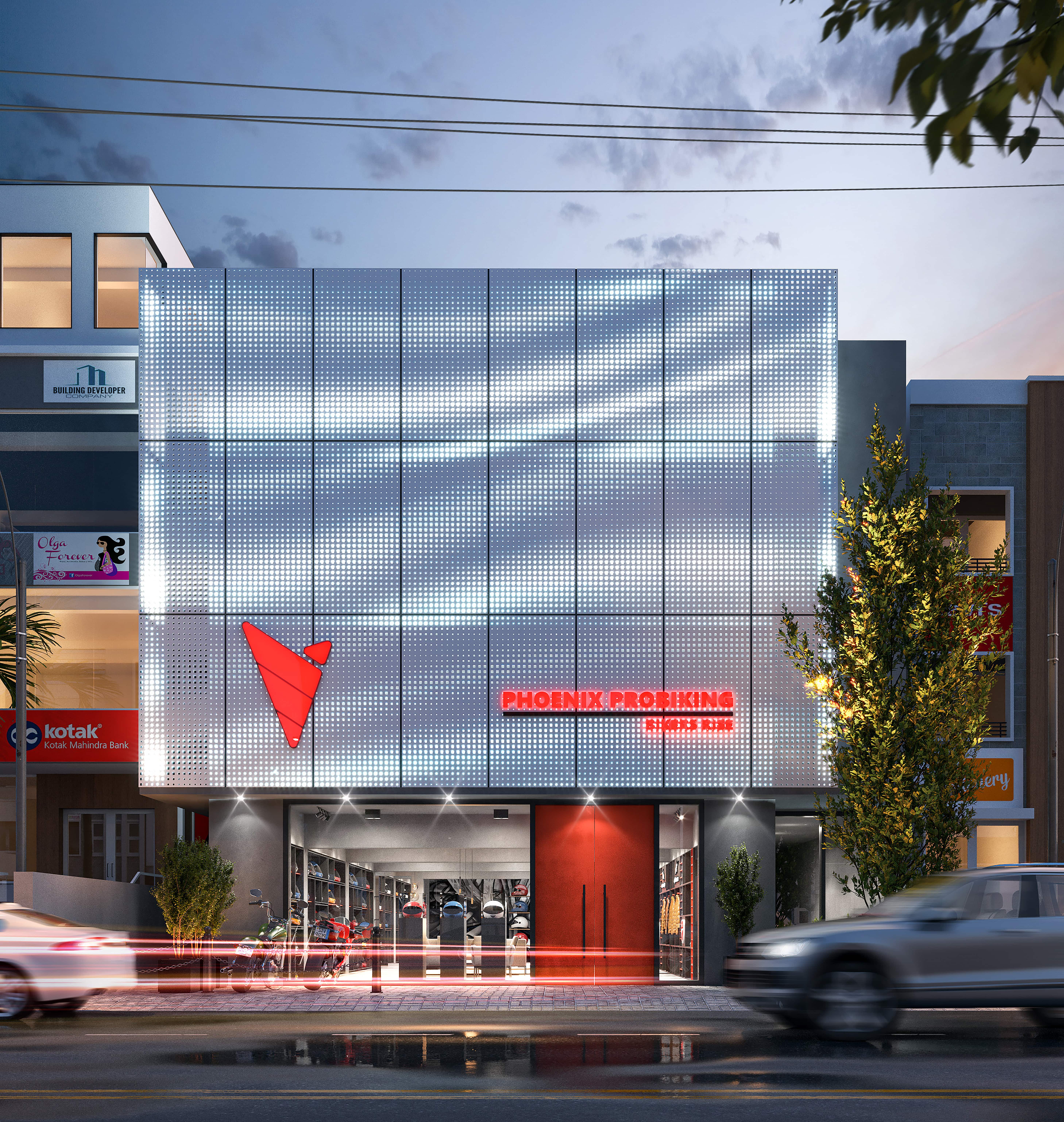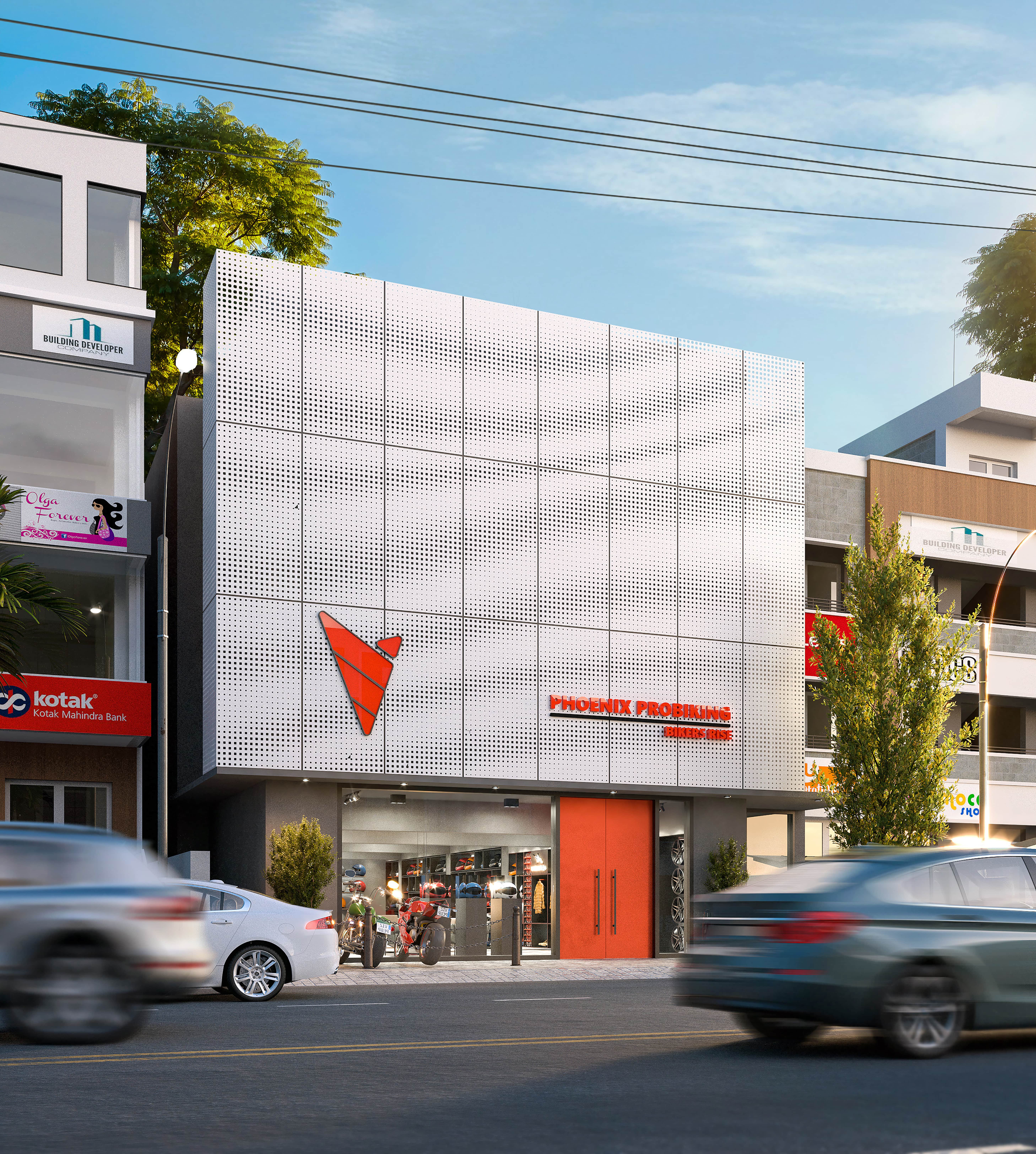 A classic Honda motorcycle is displayed as a centerpiece, reinforcing the space’s automotive theme. The red accents add vibrancy, while the open layout maintains a functional yet stylish showroom atmosphere.